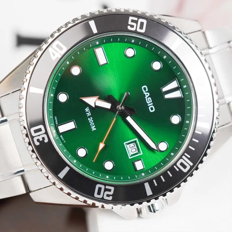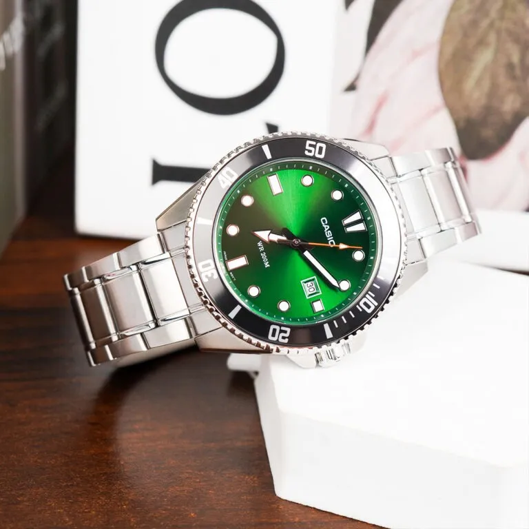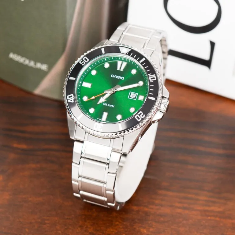 Điểm khác biệt đắt giá nhất trên mẫu Đồng Hồ Casio 46.3 mm Nam MDV-107D-3A2VDF chính là mặt số màu xanh lá lục bảo (Emerald Green).