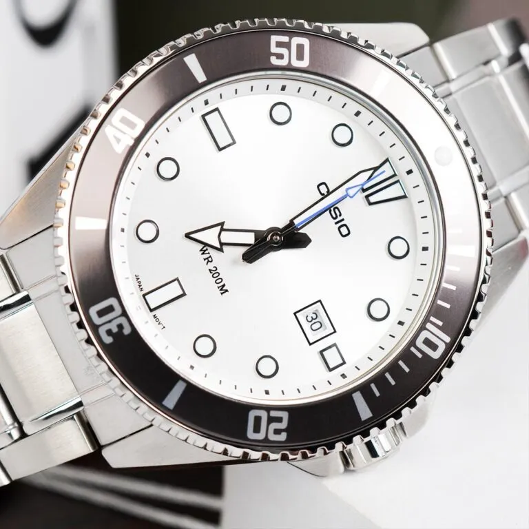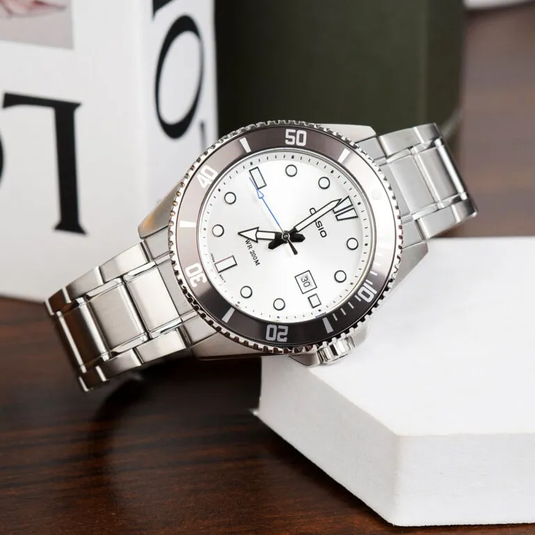 Trong cộng đồng những người yêu thích đồng hồ, dòng Casio MDV (hay còn gọi là Duro) đã trở thành một huyền thoại về độ bền và giá trị sử dụng. Tiếp nối sự thành công đó, chiếc đồng hồ Casio 46.3 mm nam MDV-107D-7AVDF xuất hiện như một bản nâng cấp đầy tinh tế. Không còn bó buộc trong những gam màu trầm tối, phiên bản mặt trắng bạc này mang đến một diện mạo mới: trẻ trung hơn, sang trọng hơn nhưng vẫn giữ trọn linh hồn của một "cỗ máy lặn" thực thụ.