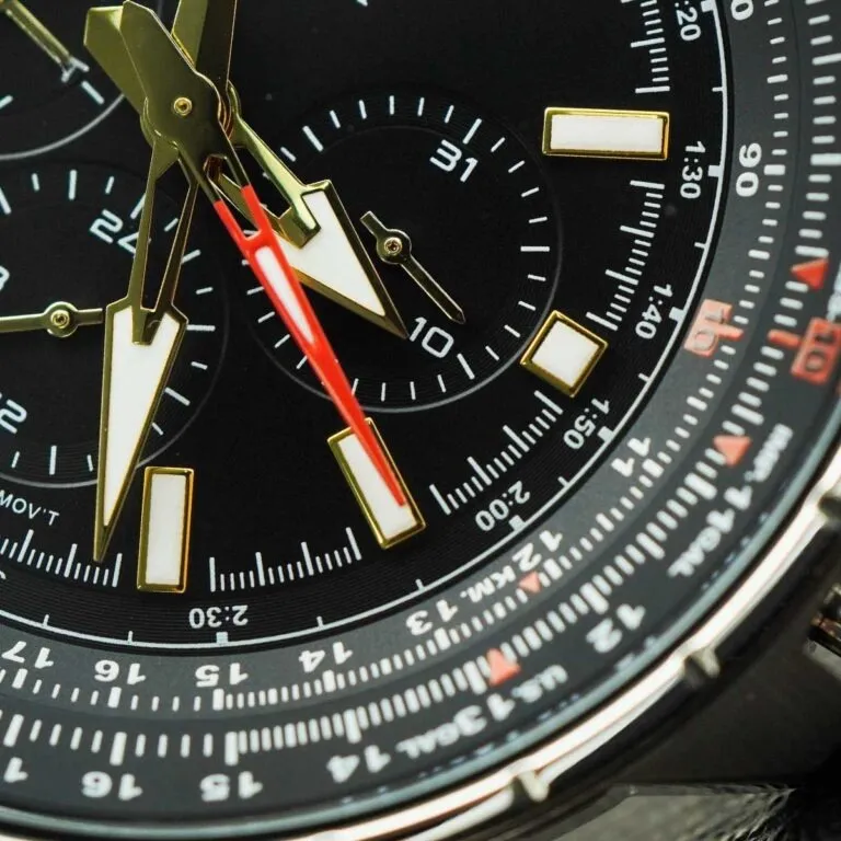 Sự kết hợp giữa nền đen sâu thẳm, kim giờ - phút màu vàng Gold và các đường chỉ số màu đỏ tạo nên một diện mạo thể thao, năng động. Bộ kim và cọc số còn được phủ dạ quang cực sáng, đảm bảo bạn luôn làm chủ thời gian ngay cả trong điều kiện thiếu sáng.