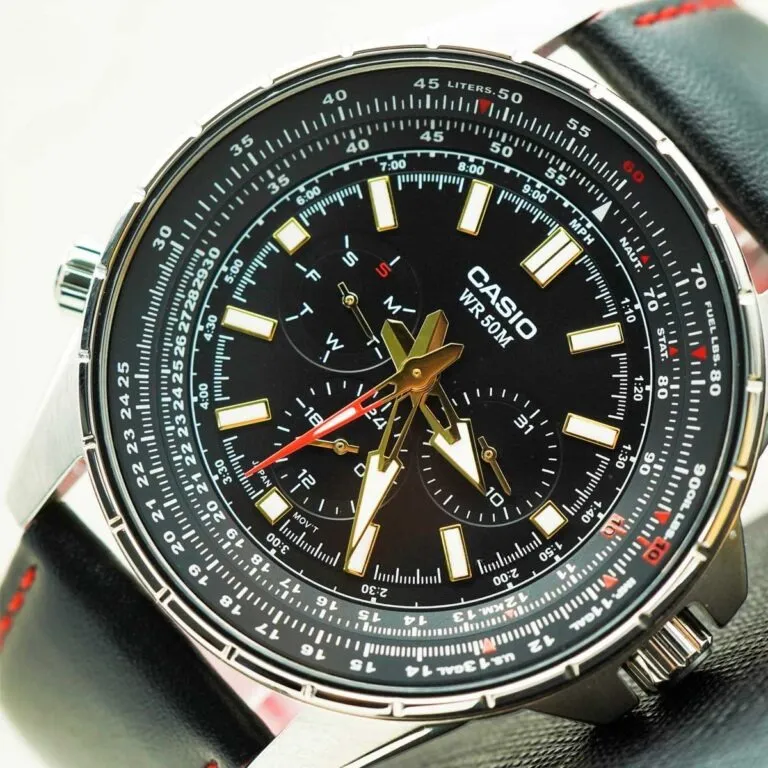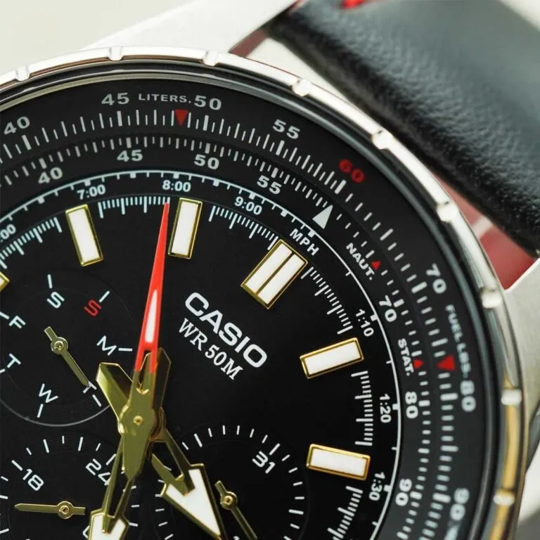Chi tiết đắt giá nhất trên đồng hồ Casio 47.5mm nam MTP-SW320L-1AVDF chính là vòng xoay Slide Rule (thước tính logarit) nằm ở viền ngoài mặt số. Trong lịch sử hàng không, đây là công cụ giúp các phi công tính toán nhanh vận tốc, mức tiêu hao nhiên liệu và khoảng cách bay.