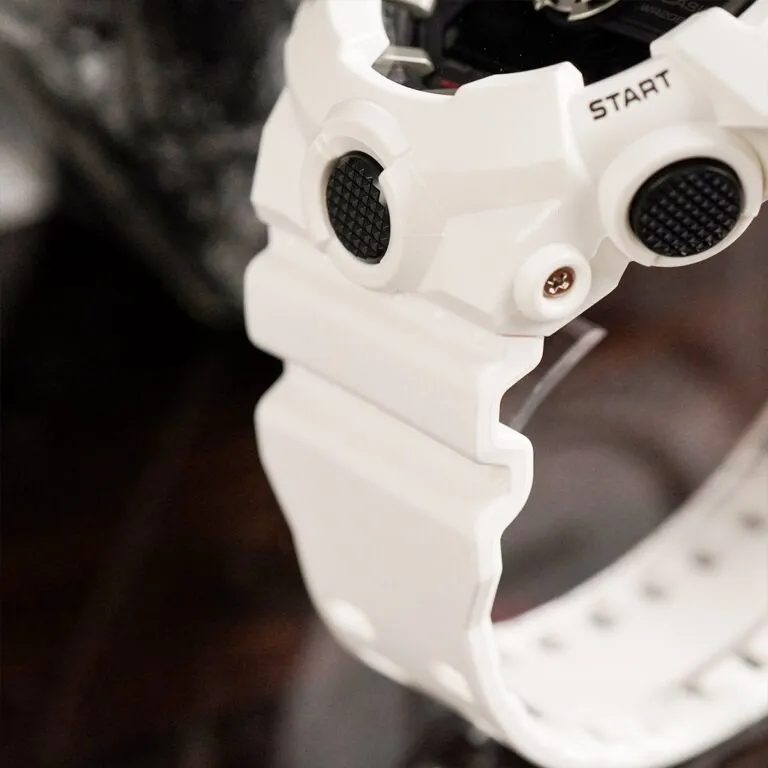 Mẫu Đồng Hồ Casio 53.4mm Nam GA-700-7ADR sở hữu lớp vỏ và dây đeo nhựa Resin màu trắng lì (matte white). Sắc trắng này không hề "điệu đà" mà ngược lại, nó làm nổi bật những đường gờ nổi khối hầm hố đặc trưng của dòng G-Shock.