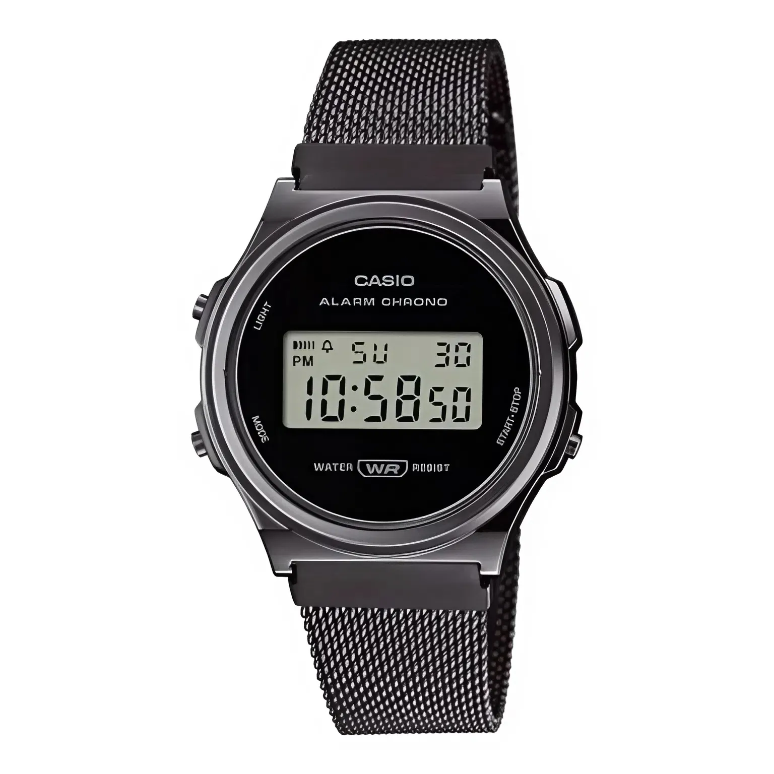 Đồng Hồ Casio Nam A171WEMB-1ADF không chỉ đơn thuần là một cỗ máy thời gian, mà là biểu tượng của sự giao thoa giữa quá khứ và tương lai. Với thiết kế mặt tròn phá cách và bộ dây lưới đen mờ thời thượng, đây chắc chắn là món quà tuyệt vời dành cho chính bạn hoặc những người thân yêu.