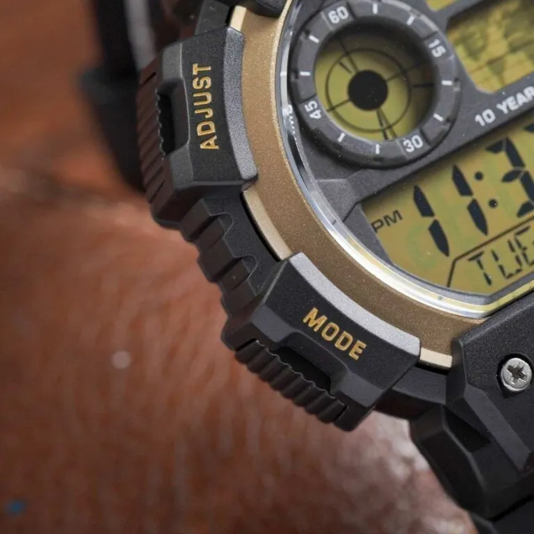 Điểm nhấn đắt giá nhất trên Đồng Hồ Casio Nam AE-1400WH-9AVDF chính là phần viền bezel và mặt số được phủ tông màu vàng đồng (Gold) cực kỳ bắt mắt. Sắc vàng này không quá chói lọi mà mang thiên hướng cổ điển, tạo nên sự tương phản hoàn hảo khi đặt cạnh bộ vỏ nhựa Resin màu đen nhám.