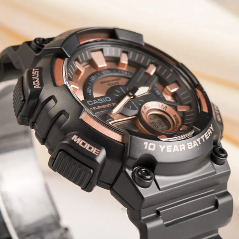 Điểm nhấn đắt giá nhất khiến Casio Nam AEQ-110W-1A3VDF khác biệt hoàn toàn với những người anh em trong dòng AEQ chính là sự kết hợp màu sắc. Lớp vỏ nhựa đen nhám đóng vai trò làm nền hoàn hảo để các chi tiết mạ vàng hồng (Rose Gold) trên mặt số tỏa sáng.