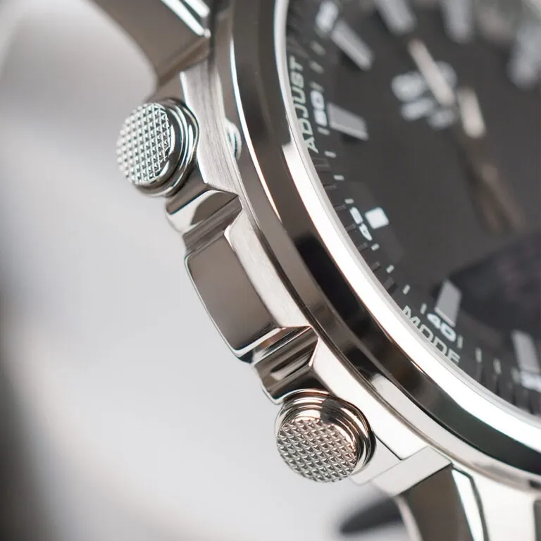 Màn hình LCD âm bản: Được đặt tinh tế ở nửa dưới mặt số, hiển thị thứ, ngày, tháng và các tính năng điện tử một cách sắc nét.