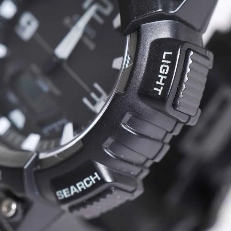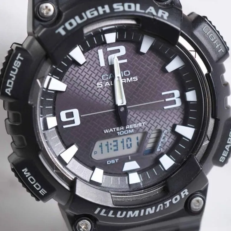 Nếu nhìn kỹ vào phần vành (bezel) của Casio Nam AQ-S810W-1AVDF, bạn sẽ thấy các dòng chữ "Tough Solar" và "Illuminator" được khắc rõ nét và sơn màu trắng nổi bật. Đây không chỉ là lời khẳng định về công nghệ mà còn là điểm nhấn trang trí giúp chiếc đồng hồ trông cứng cáp và nam tính hơn hẳn.