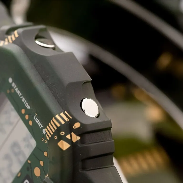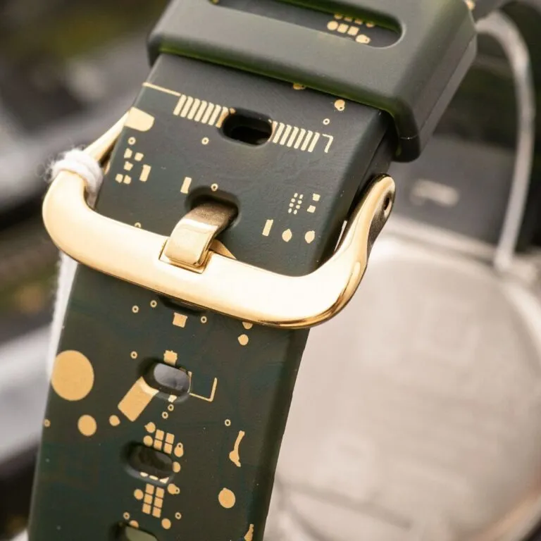 Nhờ cơ chế lẫy gạt thông minh ở phần chốt dây và cấu trúc vỏ không dùng vít truyền thống, bạn có thể tự tay biến hình chiếc đồng hồ từ họa tiết bảng mạch sang phiên bản rằn ri đen trắng hoặc nhựa mờ chỉ trong vài phút. Điều này giúp người dùng tối ưu hóa phong cách cho nhiều dịp khác nhau: từ đi làm, dạo phố đến các buổi dã ngoại ngoài trời.