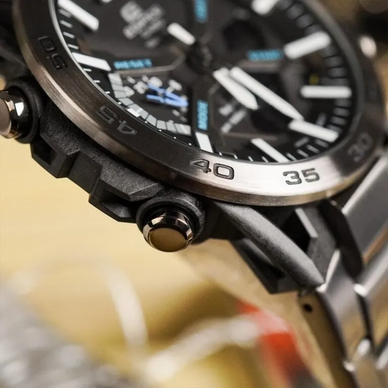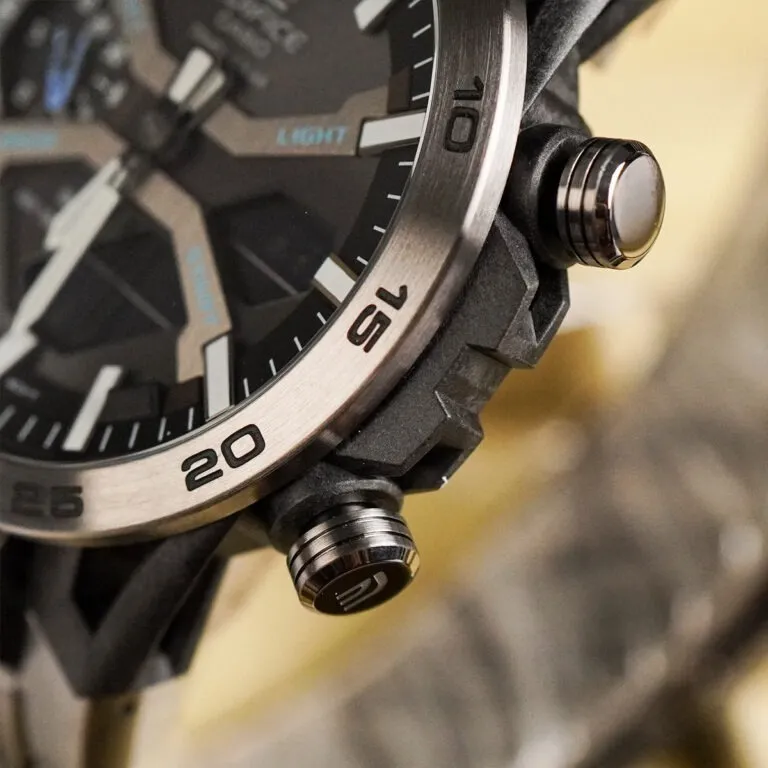 Điểm nhấn mang tính cách mạng trên Đồng hồ Casio Nam ECB-2000DC-1ADF chính là cấu trúc vỏ bốn chấu lấy ý tưởng trực tiếp từ hệ thống treo tay đòn kép của các siêu xe đua đỉnh cao. Bốn càng (lugs) được thiết kế rỗng, thanh thoát nhưng vô cùng chắc chắn, giúp tối ưu trọng lượng và tạo nên một diện mạo xuyên thấu đầy mê hoặc.
