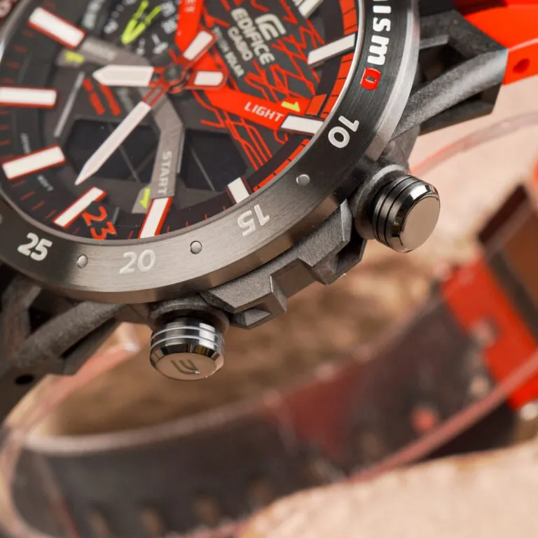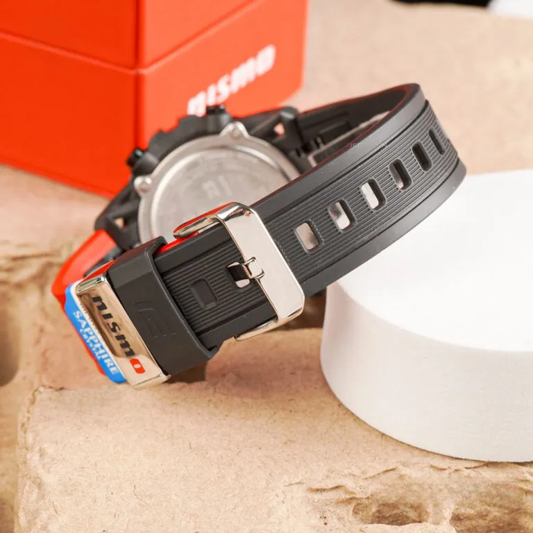 Điều đầu tiên khiến bất kỳ ai cũng phải kinh ngạc trước Đồng Hồ Casio Nam ECB-2000NIS-1ADR chính là phối màu đỏ-đen rực rỡ. Các kỹ sư đã khéo léo tái hiện hình ảnh những chiếc xe đua NISMO đang lao đi trên đường pitch thông qua những dải màu chuyển tiếp tinh tế trên mặt số và dây đeo.