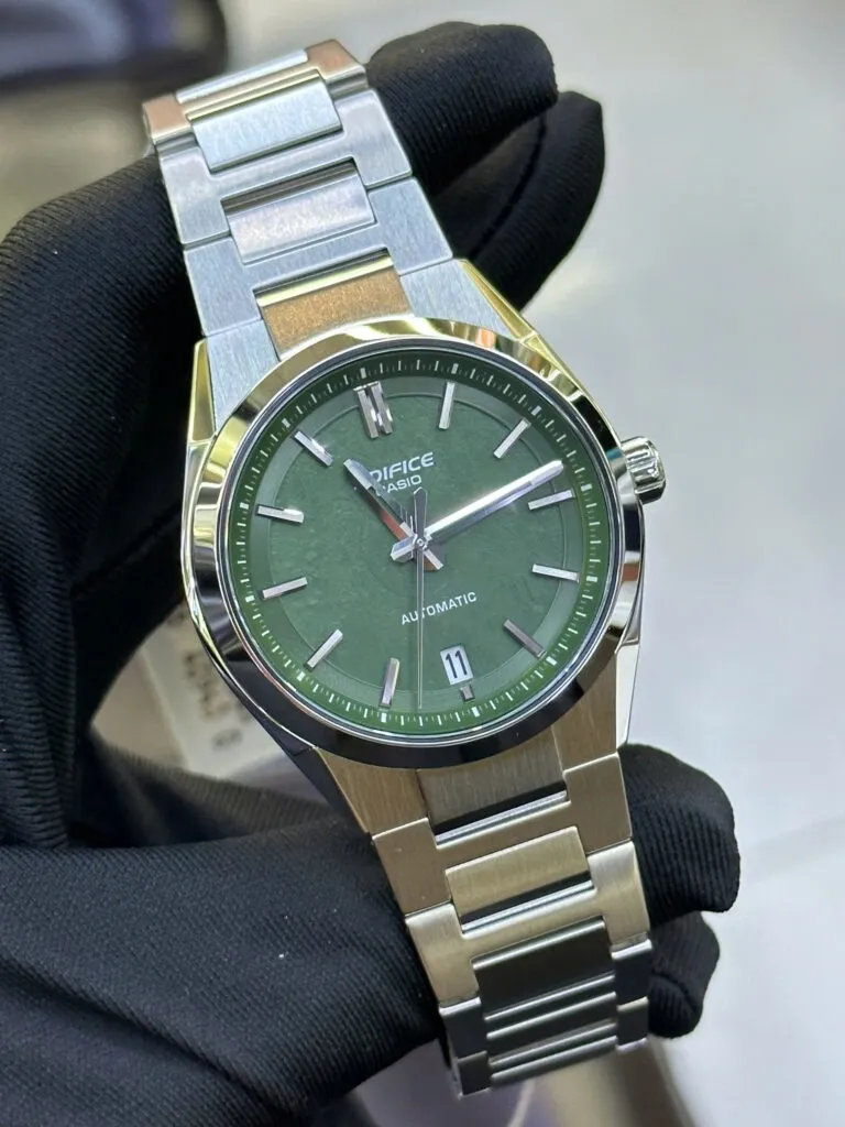 Điểm nhấn đầu tiên và mạnh mẽ nhất của Đồng hồ Casio Nam EFK-100D-3ADR chính là mặt số màu xanh lá cây (Green Dial). Không phải tông xanh lá rực rỡ, Casio chọn một sắc xanh lục sâu thẳm, gợi liên tưởng đến những rừng thông già hay sự quý phái của đá lục bảo.