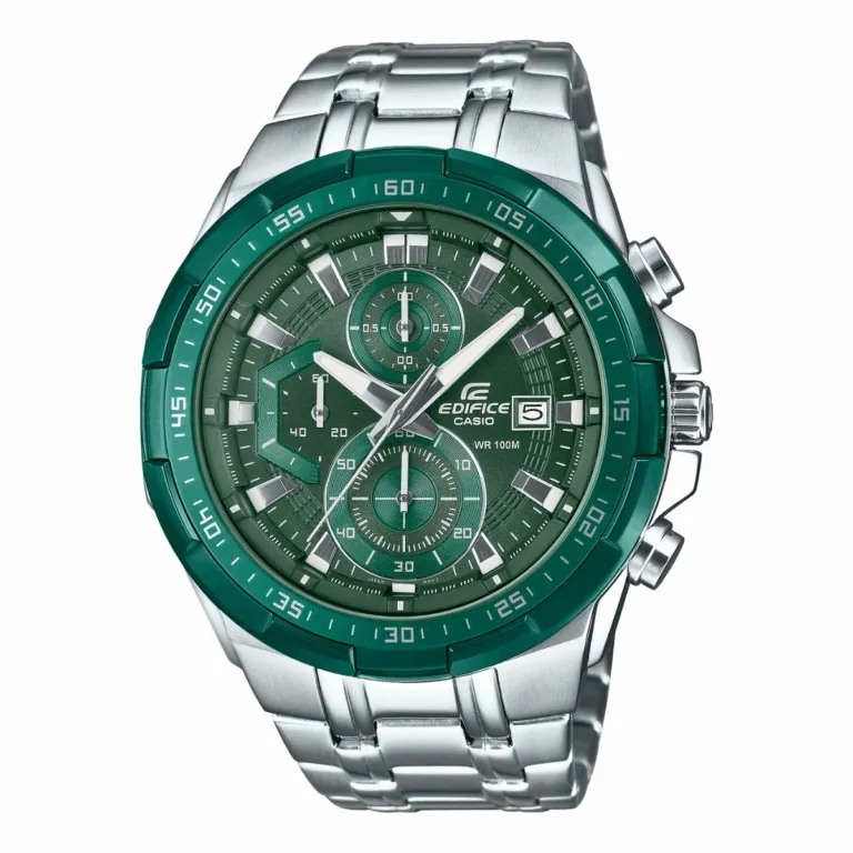 Điểm gây ấn tượng thị giác mạnh mẽ nhất ngay từ cái nhìn đầu tiên chính là vành bezel và mặt số màu xanh lá của Đồng Hồ Casio Nam EFR-539DE-3AVUDF. Thay vì những tông màu đen hay xanh dương truyền thống, Casio đã chọn sắc xanh lục bảo đậm chất quý tộc nhưng vẫn giữ được nét trẻ trung.