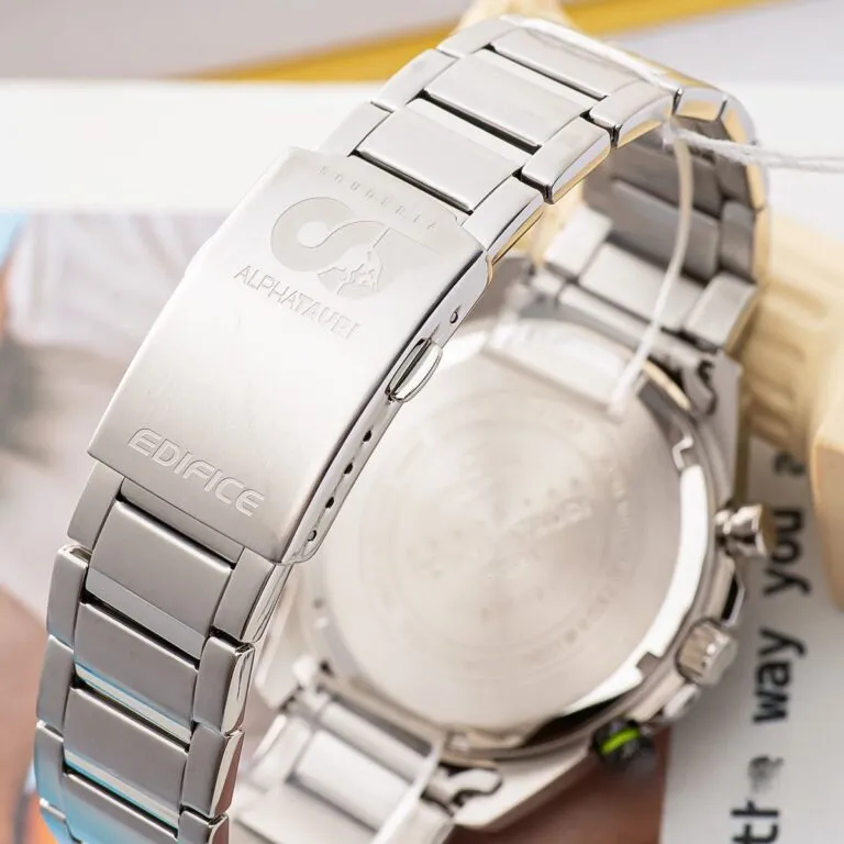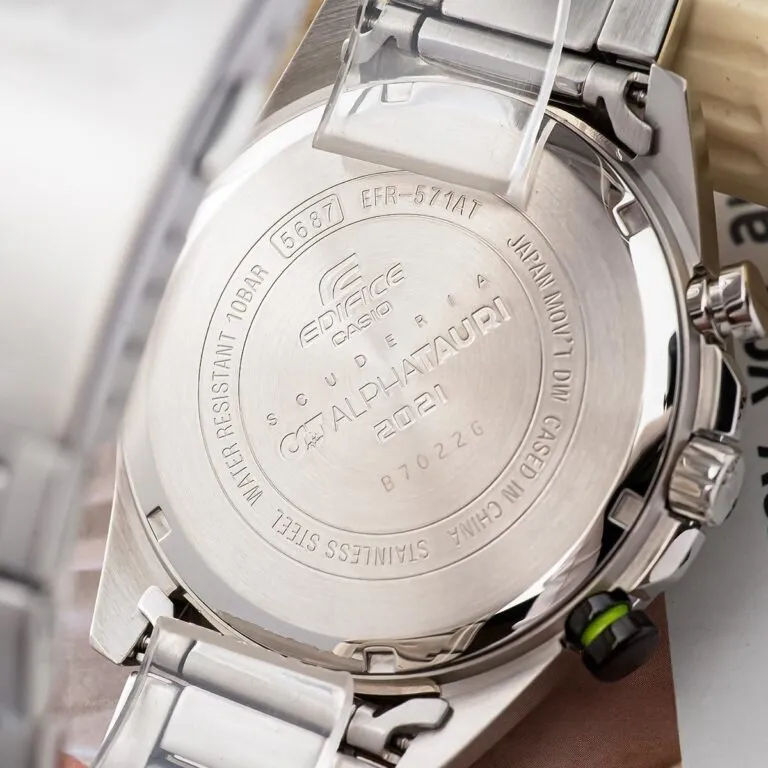 Toàn bộ màu sắc trên chiếc Đồng Hồ Casio Nam EFR-571AT-1ADR được lấy cảm hứng từ màu áo và xe đua của đội Scuderia AlphaTauri. Sự kết hợp giữa tông màu bạc của thép không gỉ 316L, sắc đen của Carbon và các chi tiết nhấn nhá màu xanh Navy tạo nên một tổng thể hài hòa, vừa năng động vừa sang trọng.