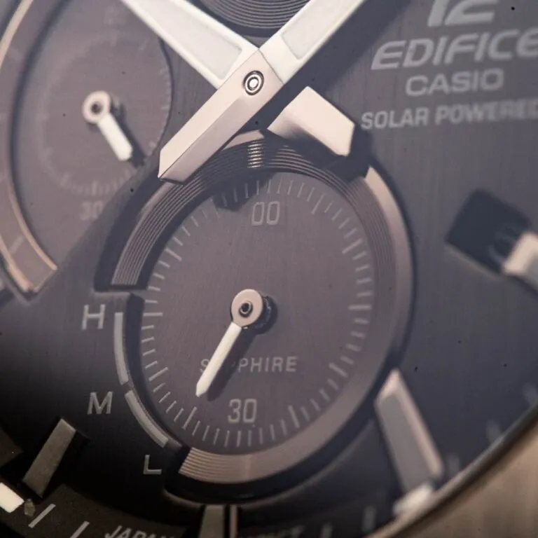 Đẳng cấp vượt trội: Kính Sapphire vốn chỉ xuất hiện trên các dòng đồng hồ cao cấp, nay đã hiện diện trên dòng EFS-S570 để nâng tầm giá trị cho người đeo.