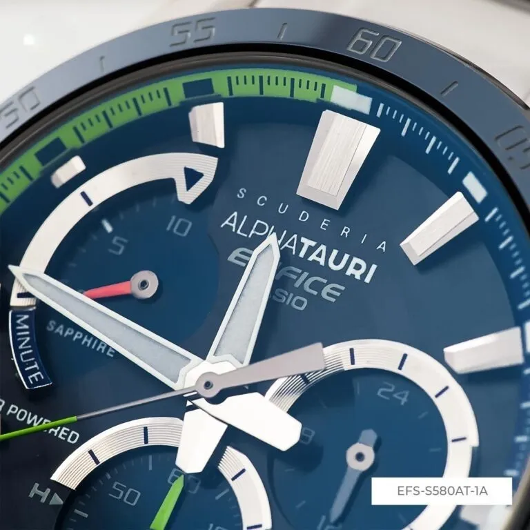 Thiết kế của Đồng Hồ Casio Nam EFS-S580AT-1ADR lấy cảm hứng trực tiếp từ đồng phục và màu xe của đội Scuderia AlphaTauri. Sự kết hợp giữa tông màu xanh navy chủ đạo, màu trắng bạc của thép và những điểm nhấn màu xanh neon trên kim chronograph cùng các nút bấm tạo nên một tổng thể hài hòa, năng động.
