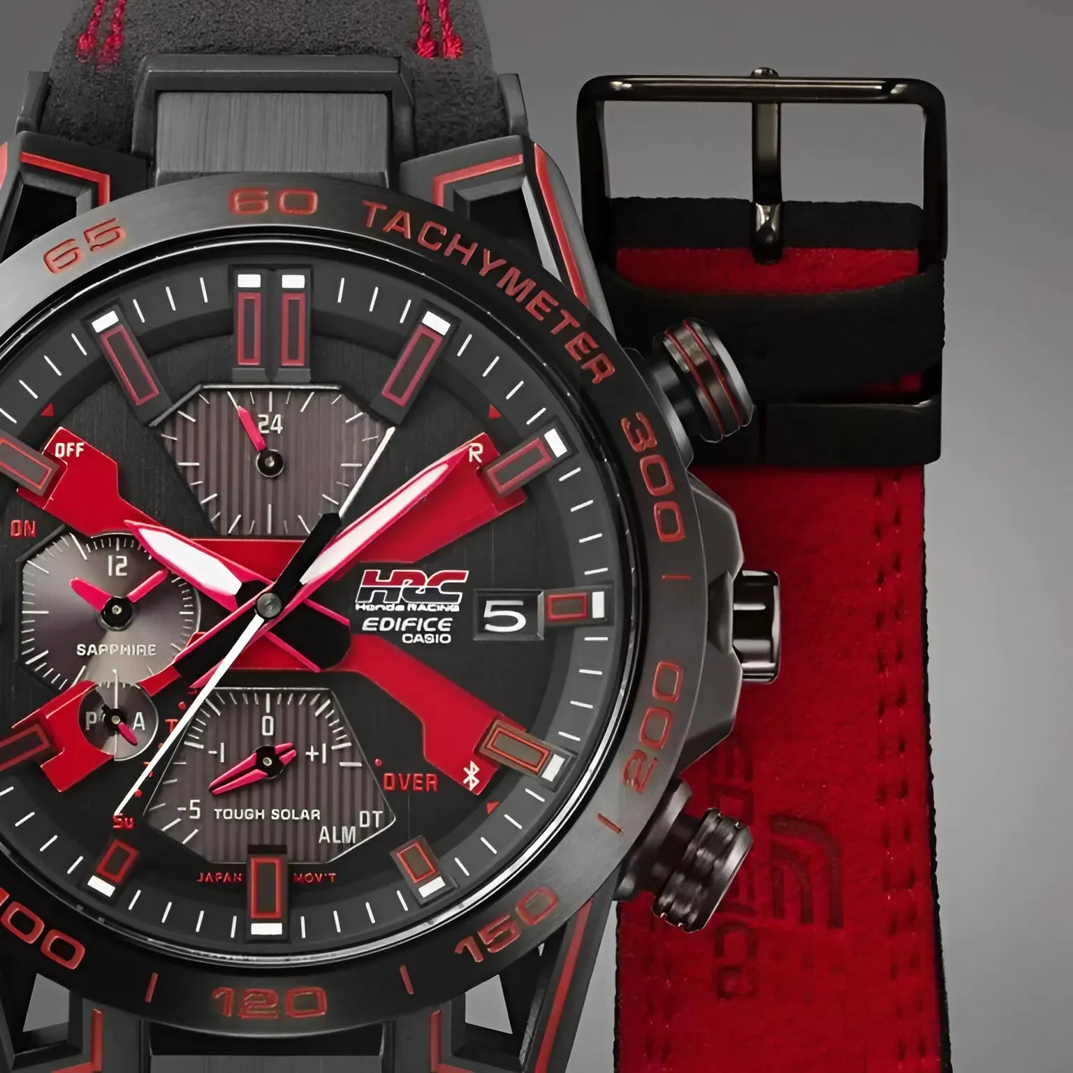 Ngay từ cái nhìn đầu tiên, Đồng Hồ Casio Nam EQB-2000HR-1ADR đã khẳng định vị thế của một phiên bản giới hạn (Limited Edition). Toàn bộ chiếc đồng hồ là sự kết hợp tinh tế giữa hai tông màu đen huyền bí và đỏ đặc trưng của đội đua Honda.