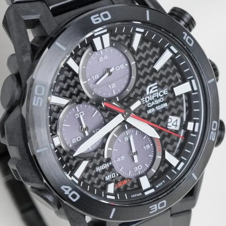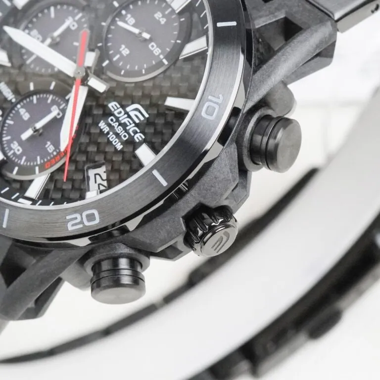 Mặt số sợi Carbon: Đây là điểm nhấn đắt giá nhất. Việc sử dụng sợi carbon không chỉ giúp đồng hồ trông cơ bắp hơn mà còn là vật liệu lý tưởng để tối ưu hóa việc hấp thụ ánh sáng cho các tấm pin năng lượng bên dưới.