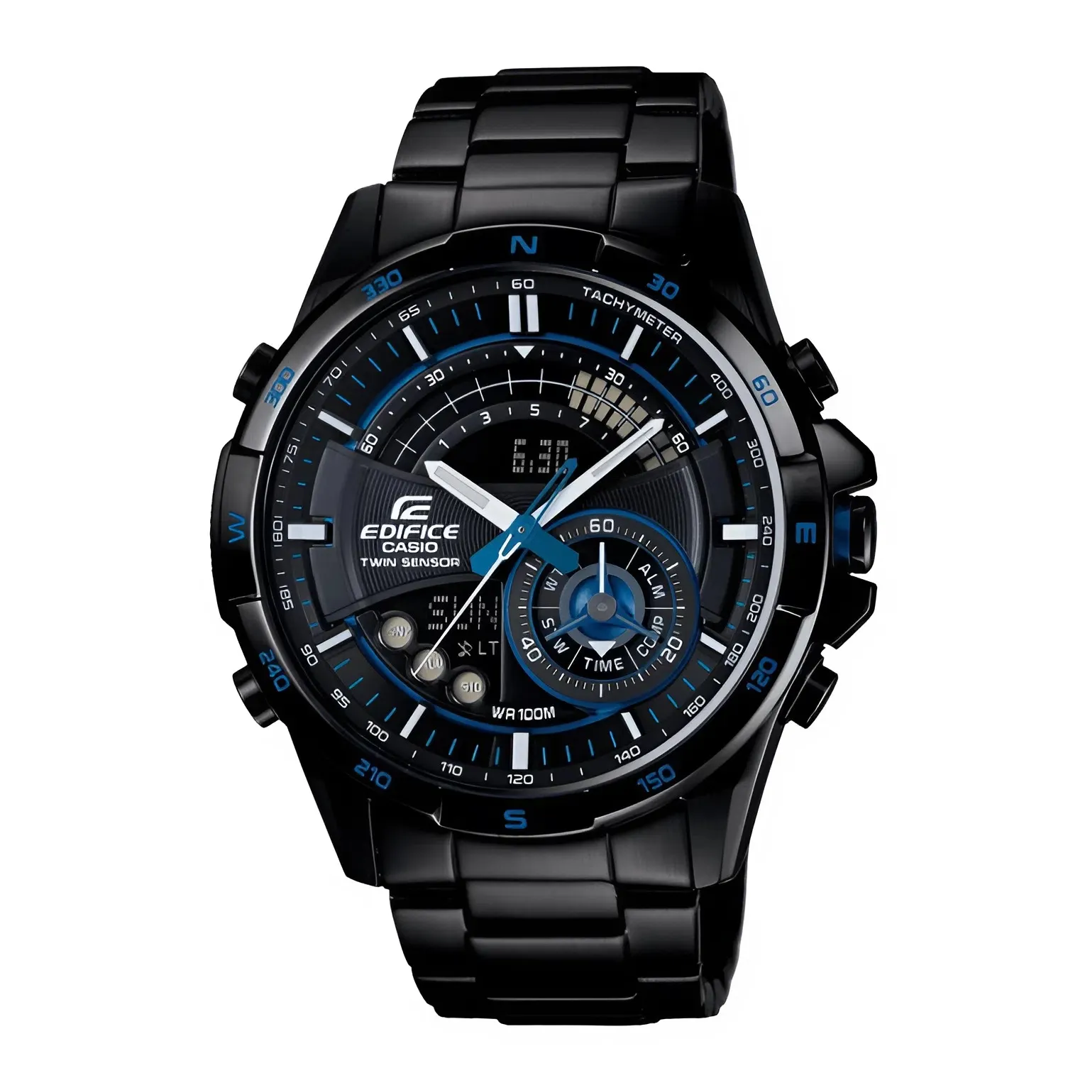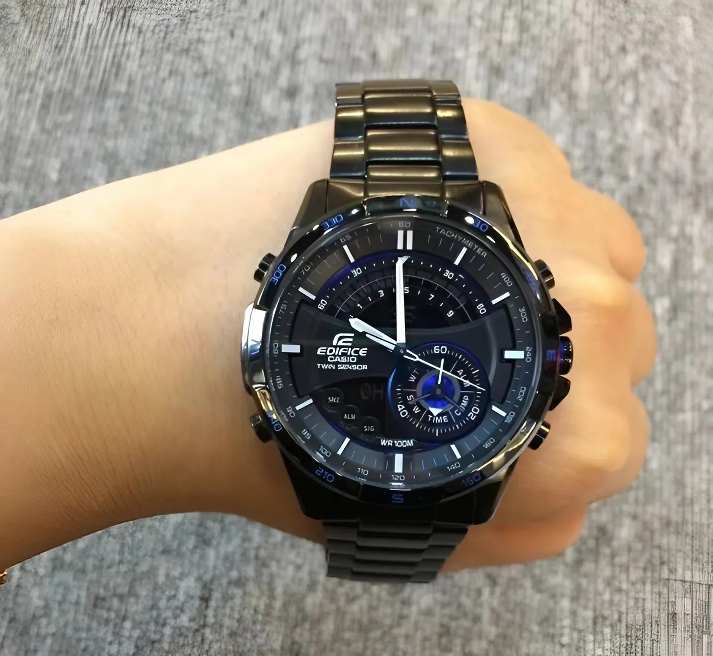 Sự tinh tế còn nằm ở các chi tiết màu xanh dương điểm xuyết trên mặt số đa tầng. Các vòng bezel phụ, kim giây và các vạch chia độ được phối màu xanh neon nổi bật trên nền đen, gợi liên tưởng đến bảng điều khiển của những chiếc xe đua công thức 1. Đây chính là DNA đặc trưng của dòng Edifice, hướng tới sự chính xác và tốc độ.