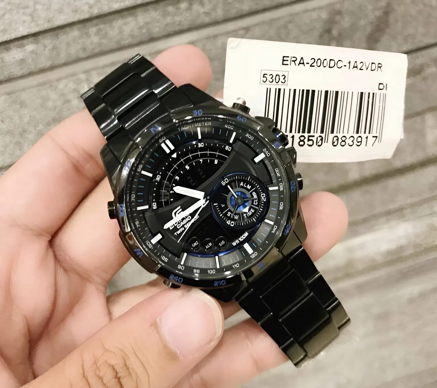 Điểm gây ấn tượng thị giác mạnh mẽ nhất của Đồng Hồ Casio Nam ERA-200DC-1A2VDR chính là lớp mạ ion đen (Black IP) bao phủ toàn bộ phần vỏ và dây đeo thép không gỉ. Lớp mạ này không chỉ tạo nên vẻ ngoài lịch lãm, nam tính mà còn có tác dụng chống trầy xước và giữ cho màu sắc của đồng hồ luôn bền đẹp theo thời gian.