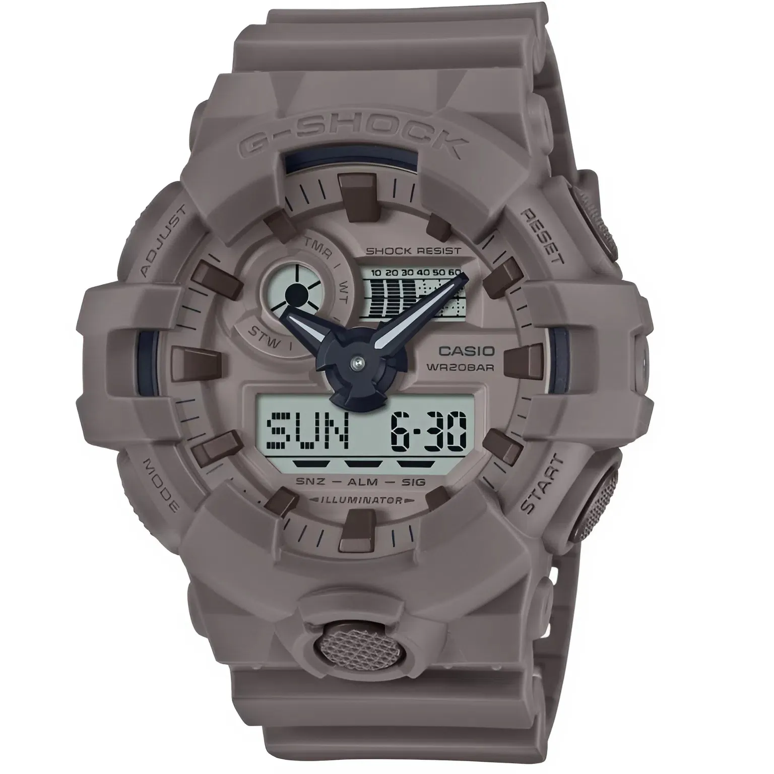 Khác với vẻ ngoài đen bóng thường thấy, Đồng hồ Casio Nam GA-700NC-5ADR khoác lên mình lớp vỏ màu nâu đất (cappuccino/tan) cực kỳ độc đáo.