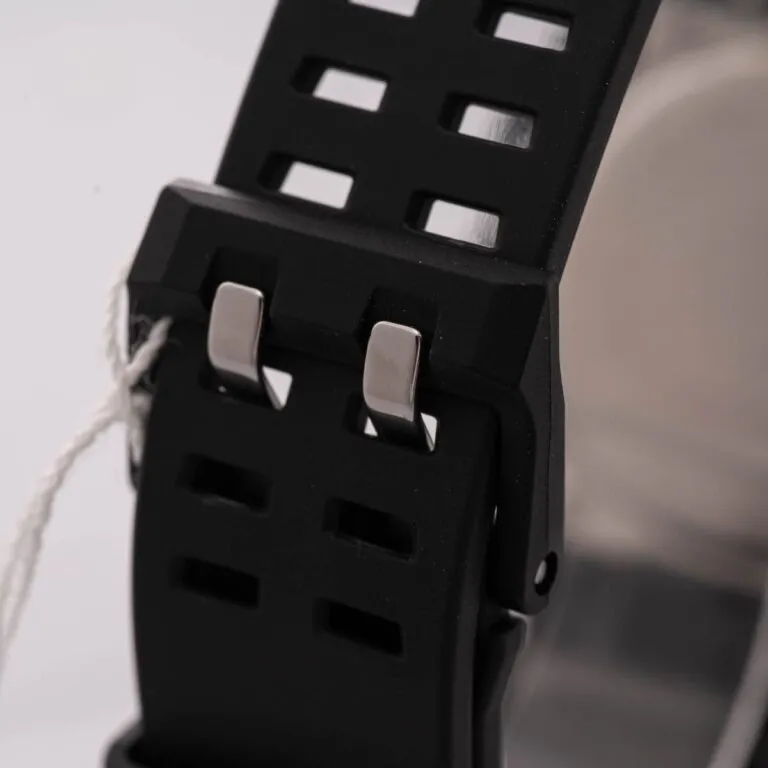 Sự hòa quyện chất liệu: Mặt trên của đồng hồ được trang bị một lớp thép không gỉ phay xước màu bạc sang trọng, tương phản mạnh mẽ với phần thân nhựa đen bền bỉ.