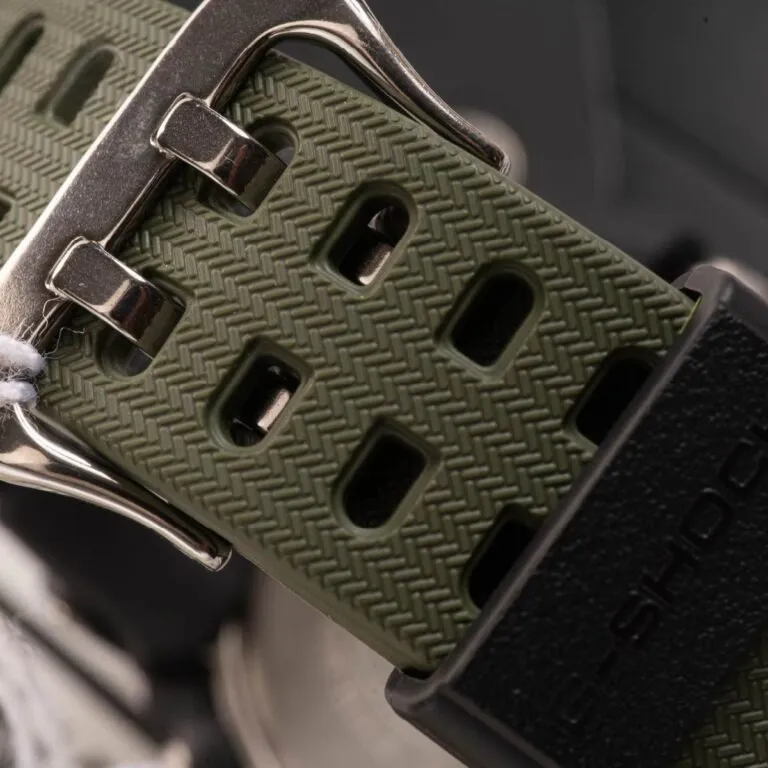 Đồng Hồ Casio Nam GG-1000-1A3DR mang trên mình phối màu đặc trưng của phong cách quân đội với dây nhựa màu xanh lục (Army Green) phối cùng mặt số đen mạnh mẽ. Vỏ đồng hồ to bản, góc cạnh với các chi tiết bảo vệ nhô cao tạo nên vẻ ngoài hầm hố, sẵn sàng đối mặt với mọi va đập.