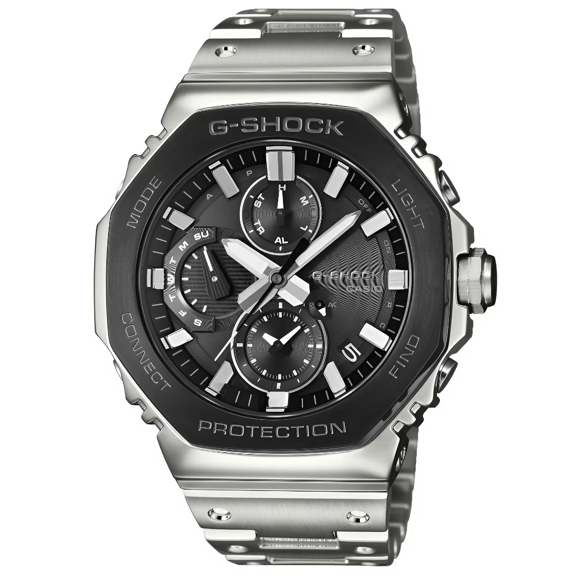 Kế thừa DNA từ dòng 2100 huyền thoại, nhưng Đồng Hồ Casio Nam GMC-B2100BT-1ADR đã loại bỏ hoàn toàn các chi tiết nhựa để thay thế bằng kim loại nguyên khối. Từ vành bezel, vỏ cho đến dây đeo đều được chế tác từ thép không gỉ cao cấp, mang lại cảm giác đầm tay, chắc chắn và vô cùng sang trọng.