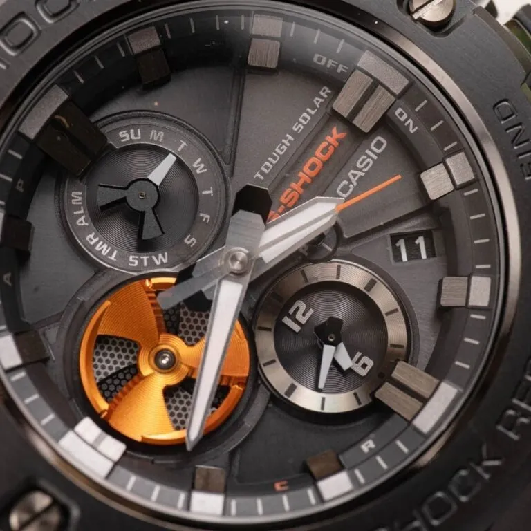 Điểm nhận dạng đặc trưng của dòng GST-B100 chính là đĩa xoay ở vị trí 9 giờ, được thiết kế mô phỏng theo cánh quạt turbine của động cơ phản lực. Trên mẫu Đồng hồ Casio Nam GST-B100B-1A4DR, các chi tiết kim giây, vạch số và chữ trên mặt số được điểm xuyết bằng màu cam rực rỡ.
