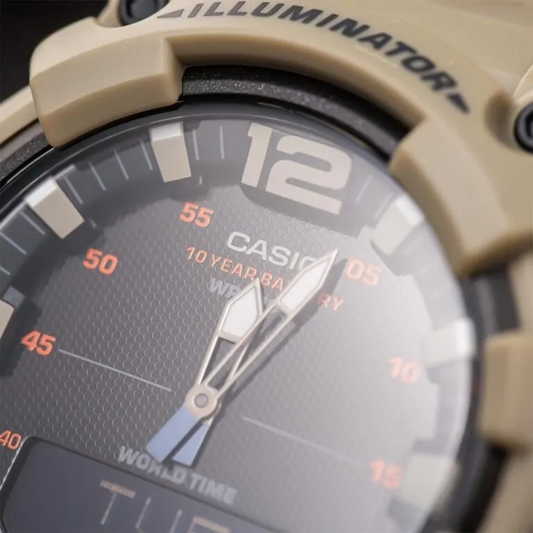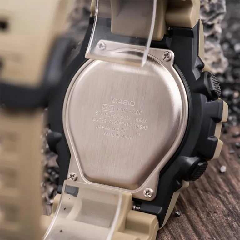 Điểm thu hút nhất của Đồng Hồ Casio Nam HDC-700-3A3VDF chính là phối màu xanh cát (Tan) phối cùng mặt số đen trầm mặc. Đây là tông màu "Tactical" thường thấy trên các thiết bị quân sự chuyên dụng, giúp mẫu đồng hồ này toát lên vẻ phong trần, bụi bặm nhưng vẫn cực kỳ hiện đại.