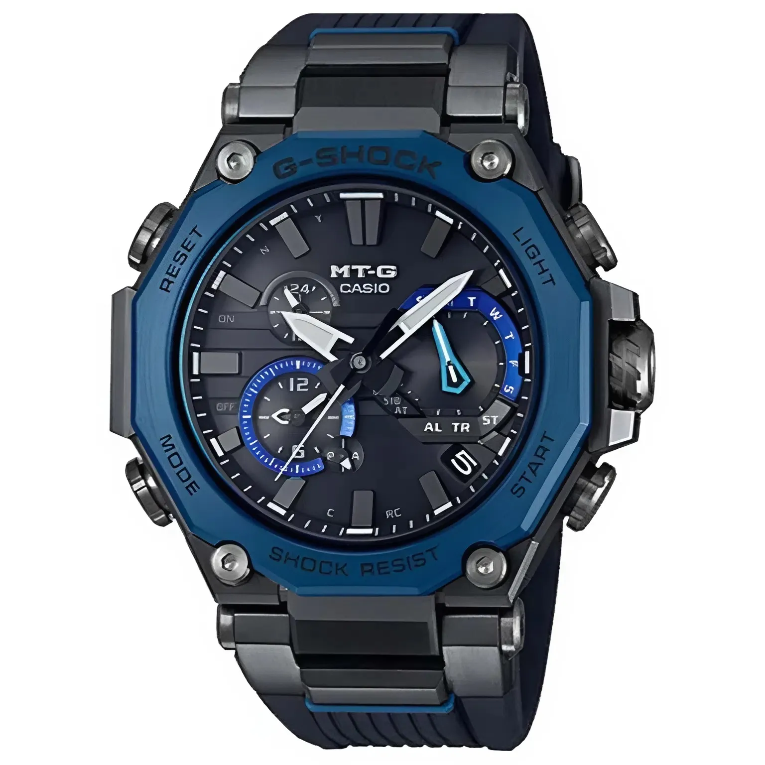 Vẻ đẹp ngoại diện của Đồng Hồ Casio Nam MTG-B2000B-1A2DR được định nghĩa bởi vành bezel hình bát giác độc đáo. Lớp mạ ion màu xanh (Blue IP) trên vành thép không gỉ không chỉ tạo nên sự tương phản hoàn hảo với lớp vỏ đen mờ mà còn mang lại nét sang trọng, lịch lãm khó cưỡng.