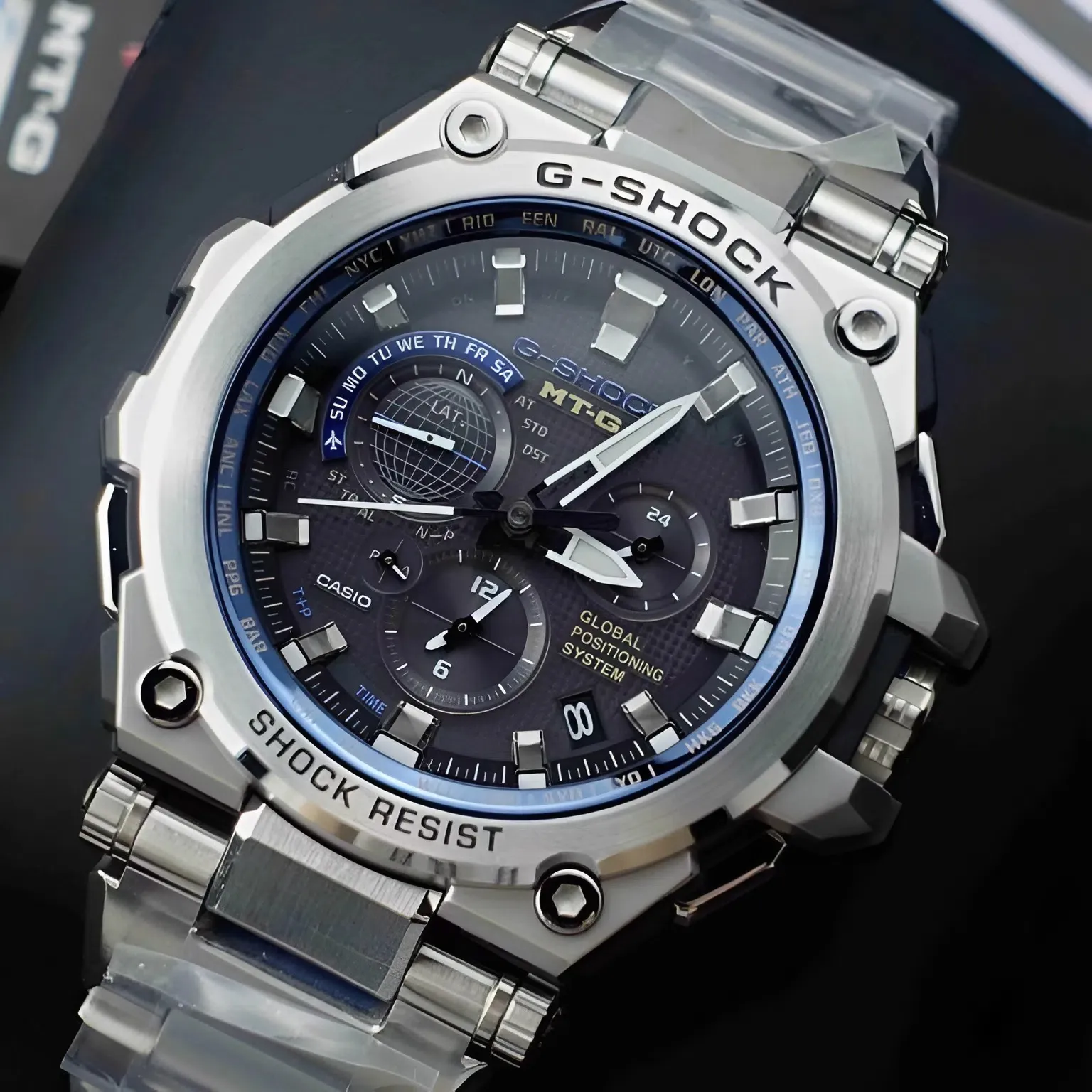 Khác với những phiên bản màu vàng rực rỡ, Đồng Hồ Casio Nam MTG-G1000D-1A2DR chọn cho mình tông màu bạc nguyên bản của thép không gỉ, điểm xuyết bởi những chi tiết xanh dương (Navy Blue) tinh tế trên vòng bezel và các mặt số phụ. Sự phối màu này tạo nên vẻ ngoài thanh lịch nhưng không kém phần lạnh lùng, rất phù hợp với các quý ông làm việc trong môi trường công sở cao cấp hoặc thường xuyên gặp gỡ đối tác.