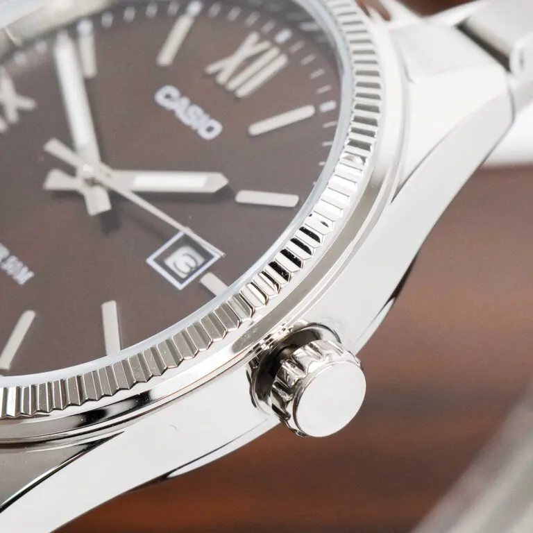 Bao bọc lấy mặt số nâu ấm áp là phần vành bezel dạng rãnh khía (vành băm) biểu tượng. Đây là chi tiết thường thấy trên các dòng đồng hồ xa xỉ, giúp đồng hồ Casio Nam MTP-1302DD-5AVDF trông đắt tiền hơn gấp nhiều lần so với giá trị thực. Vành băm không chỉ tạo độ bắt sáng tuyệt vời mà còn mang lại cảm giác mạnh mẽ, góc cạnh, kìm lại nét mềm mại của tông màu nâu, tạo nên một tổng thể nam tính hoàn hảo.