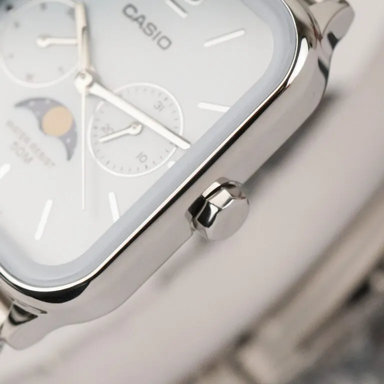 Nếu mặt vuông mang lại hơi thở hiện đại, thì ô cửa sổ Moon Phase (lịch tuần trăng) lại là nơi lưu giữ nét cổ điển đầy lãng mạn cho Đồng Hồ Casio Nam MTP-M305D-2AVDF. Tại góc 6 giờ, hình ảnh mặt trăng vàng rực và những vì sao nhỏ xinh sẽ thay đổi hình dạng theo từng ngày trong tháng, mô phỏng chính xác chu kỳ trăng khuyết ngoài vũ trụ.
