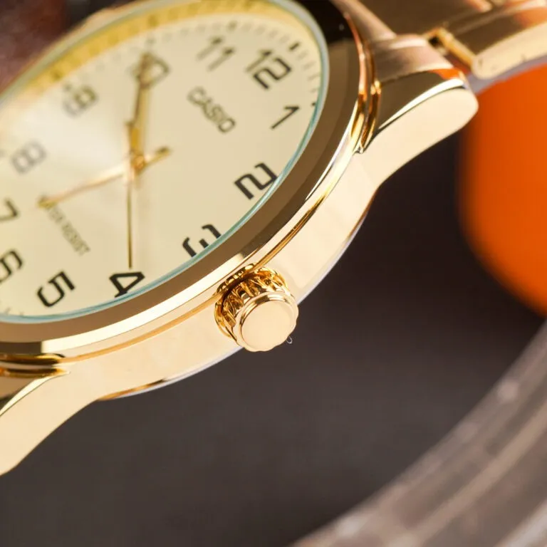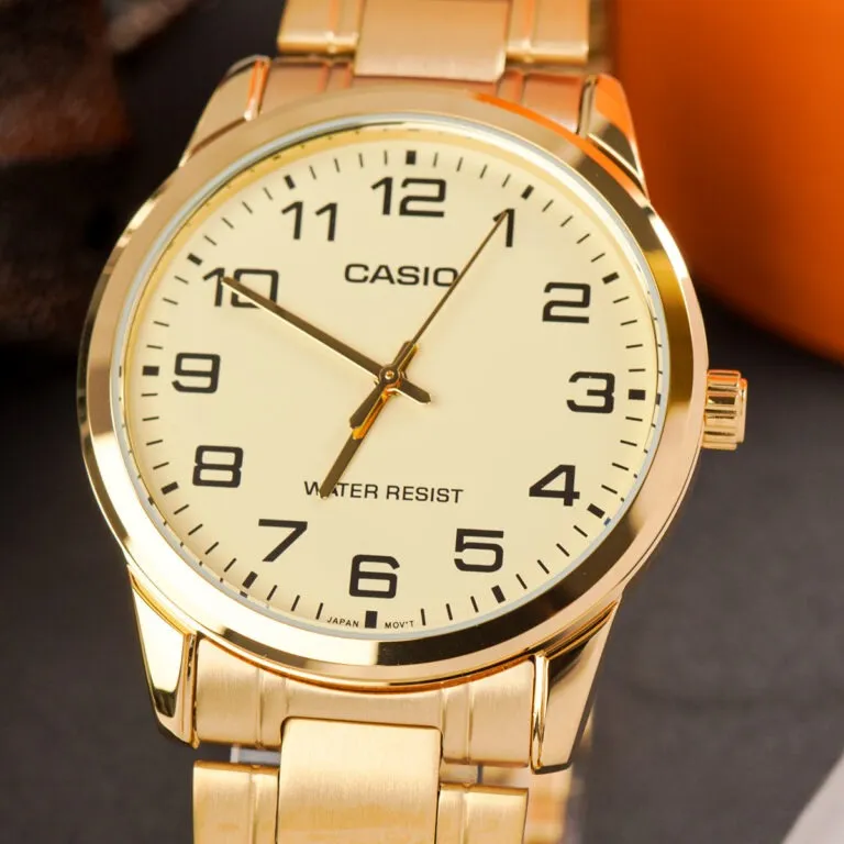 Sức hút đầu tiên của Đồng Hồ Casio Nam MTP-V001G-9BUDF đến từ lớp áo mạ vàng hoàng kim vô cùng bắt mắt. Khác với những tông vàng chói gắt, sắc vàng trên mẫu đồng hồ này được Casio xử lý mượt mà, tạo nên độ bóng bẩy vừa phải, mang lại cảm giác sang trọng và đẳng cấp như một chiếc đồng hồ xa xỉ.