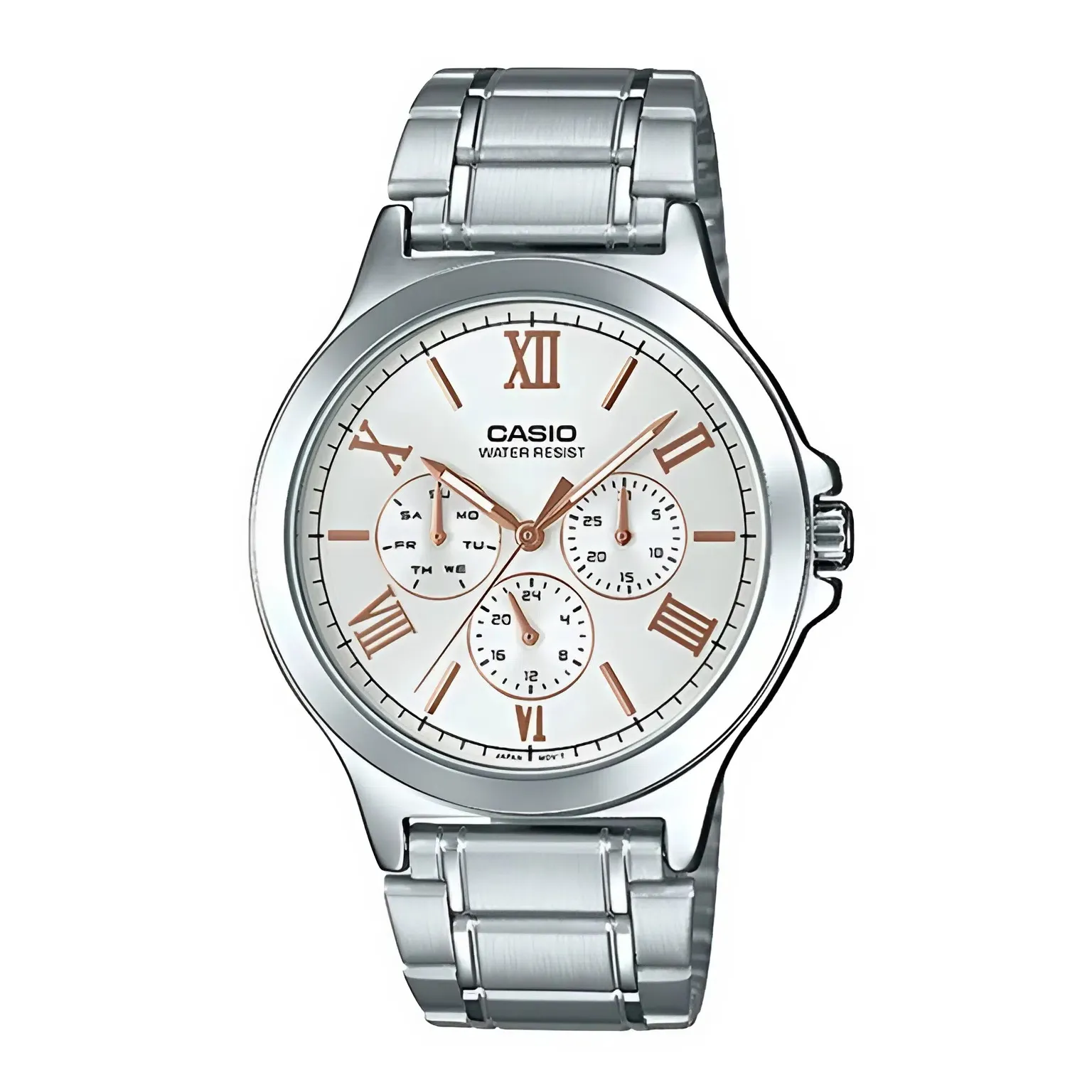 Cọc số La Mã vàng hồng: Để tăng thêm phần cổ điển và sang trọng, Casio đã sử dụng các chữ số La Mã xen kẽ vạch chia giờ. Tông màu vàng hồng (Rose Gold) nổi bật trên nền trắng không chỉ tạo vẻ quyền quý mà còn giúp người dùng dễ dàng quan sát thời gian.