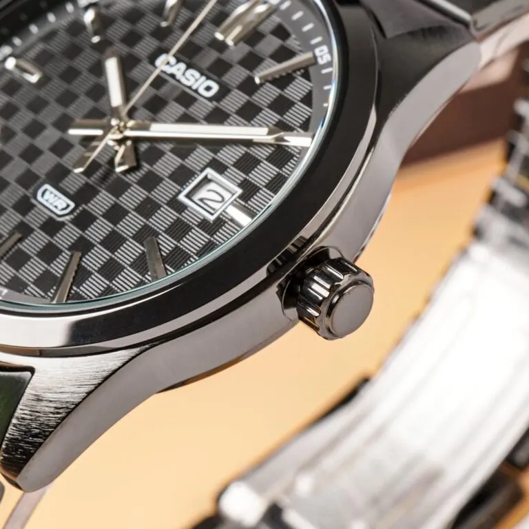Điểm làm nên sự khác biệt giữa Đồng Hồ Casio Nam MTP-VD03B-1AUDF và hàng ngàn mẫu đồng hồ đen khác chính là họa tiết mặt số. Casio đã đưa họa tiết caro (checkerboard) vào nền mặt số đen. Dưới các góc nhìn và điều kiện ánh sáng khác nhau, các ô vuông đen xám đan xen sẽ tạo ra hiệu ứng chuyển sáng 3D độc đáo, giống như một bàn cờ nghệ thuật ngay trên cổ tay bạn.