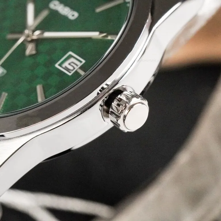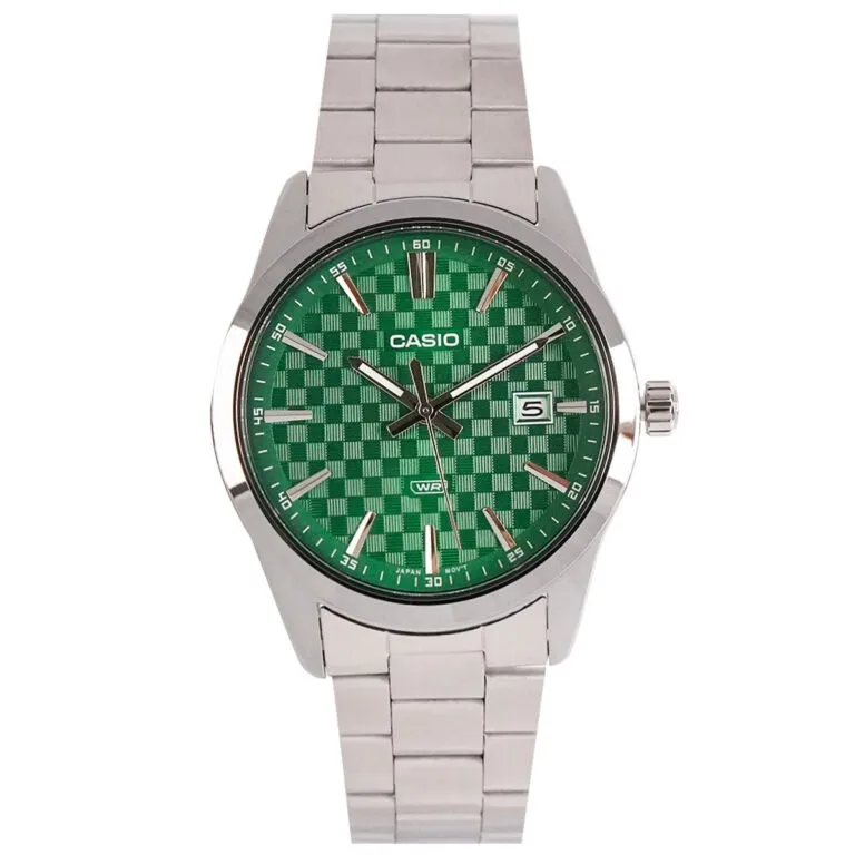 Chi tiết đắt giá nhất khiến Đồng Hồ Casio Nam MTP-VD03D-3A1UDF trở nên khác biệt hoàn toàn so với các đối thủ cùng tầm giá chính là họa tiết ô vuông (Checkerboard) trên mặt số. Với tông màu xanh lá chủ đạo — màu sắc của sự thịnh vượng và tươi mới — các ô vuông được thiết kế chuyển sắc đậm nhạt đan xen, tạo nên hiệu ứng thị giác 3D vô cùng bắt mắt.
