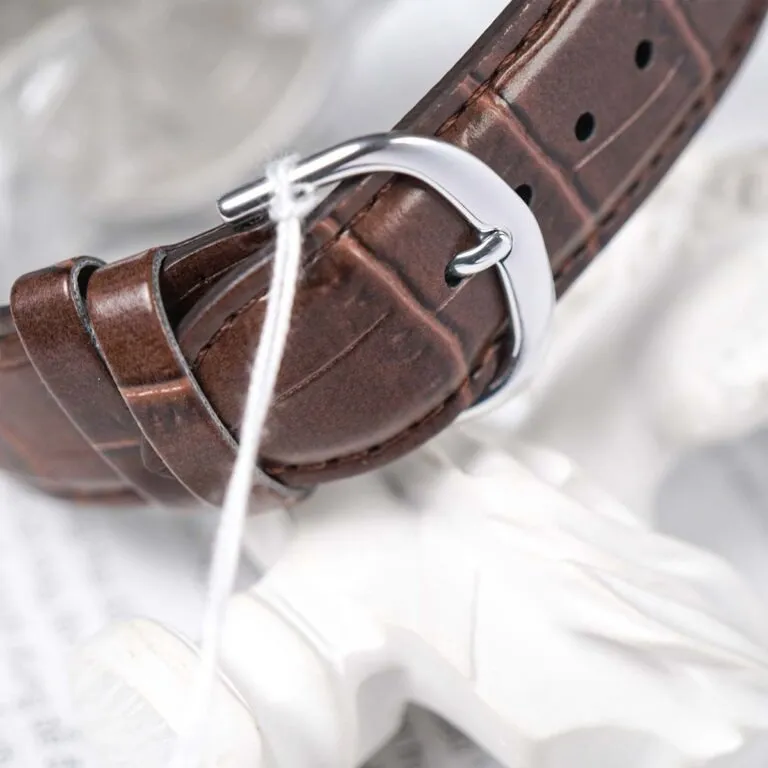 Đối lập với vẻ ngoài mạnh mẽ đó là bộ dây đeo bằng da thật màu nâu cà phê với vân cá sấu sang trọng. Sự tương phản giữa sắc đen hiện đại và sắc nâu cổ điển giúp chiếc đồng hồ thoát khỏi cái mác "thuần thể thao" để trở nên lịch lãm, phù hợp với cả những bộ Suit trang trọng nhất.