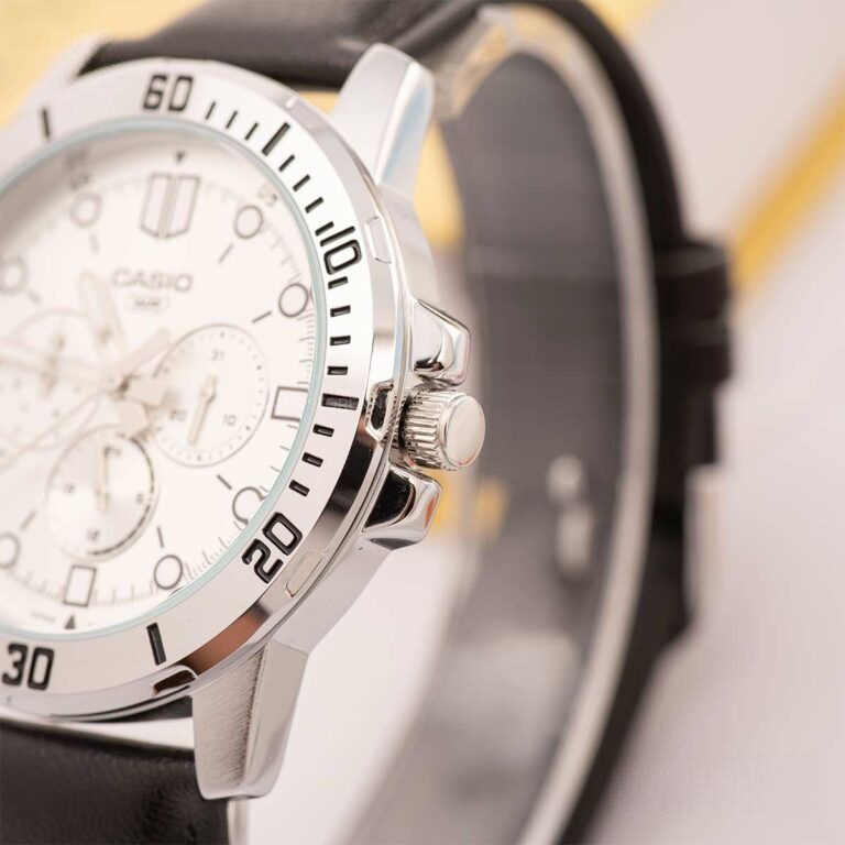 Có một quy luật bất biến trong thời trang: Trắng và Đen luôn là cặp bài trùng tạo nên sự sang trọng nhất. Đồng Hồ Casio Nam MTP-VD300L-7EUDF tận dụng triệt để quy luật này với mặt số màu trắng bạc thanh khiết kết hợp cùng dây đeo bằng da màu đen cao cấp.