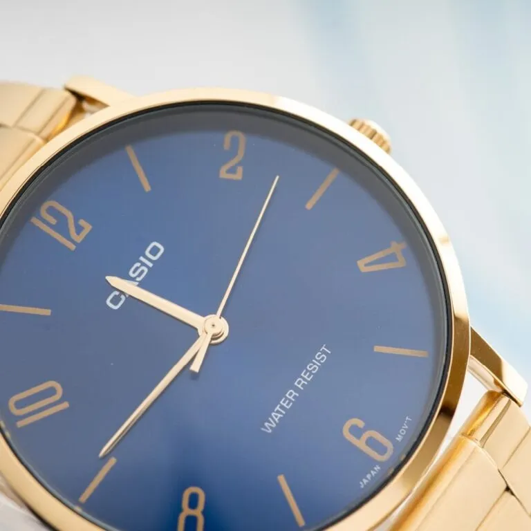 Tuy nhiên, "linh hồn" thực sự lại nằm ở mặt số xanh dương (Blue dial). Màu xanh này mang lại chiều sâu tĩnh lặng, làm nền hoàn hảo cho các chữ số và cọc vạch mạ vàng hiện lên rõ nét. Sự tương phản giữa hai tông màu nóng - lạnh này tạo nên một hiệu ứng thị giác sang trọng, giúp Đồng Hồ Casio Nam MTP-VT01G-2B2UDF luôn là tâm điểm của mọi ánh nhìn.