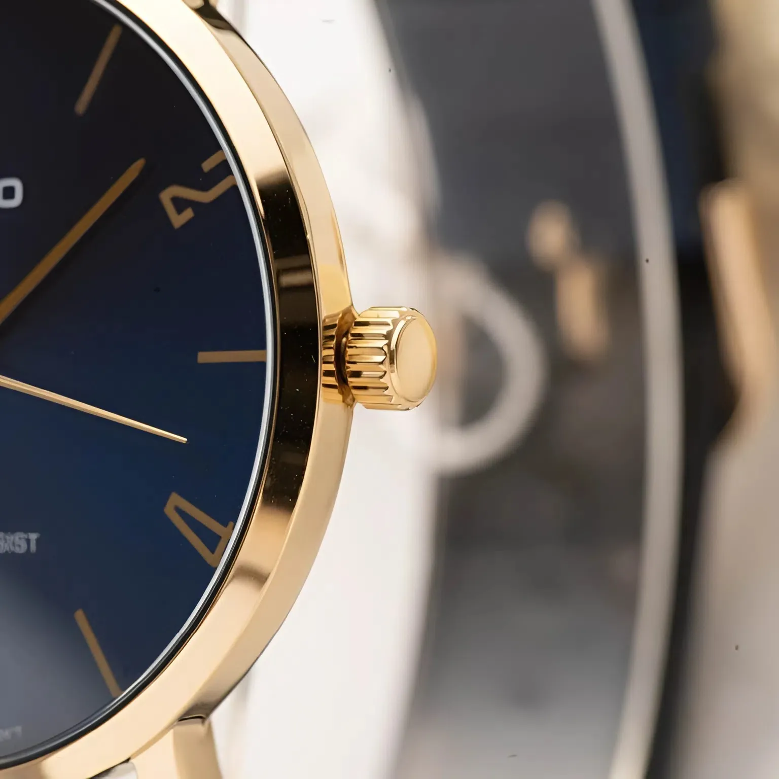Sự tương phản giữa ánh vàng vương giả của bộ vỏ mạ ion và sắc xanh trầm mặc của mặt số tạo nên một hiệu ứng thị giác vô cùng đắt giá. Màu xanh Navy không chỉ gợi lên sự tin cậy, điềm tĩnh mà còn giúp làn da tay của người đeo trông sáng và nam tính hơn.
