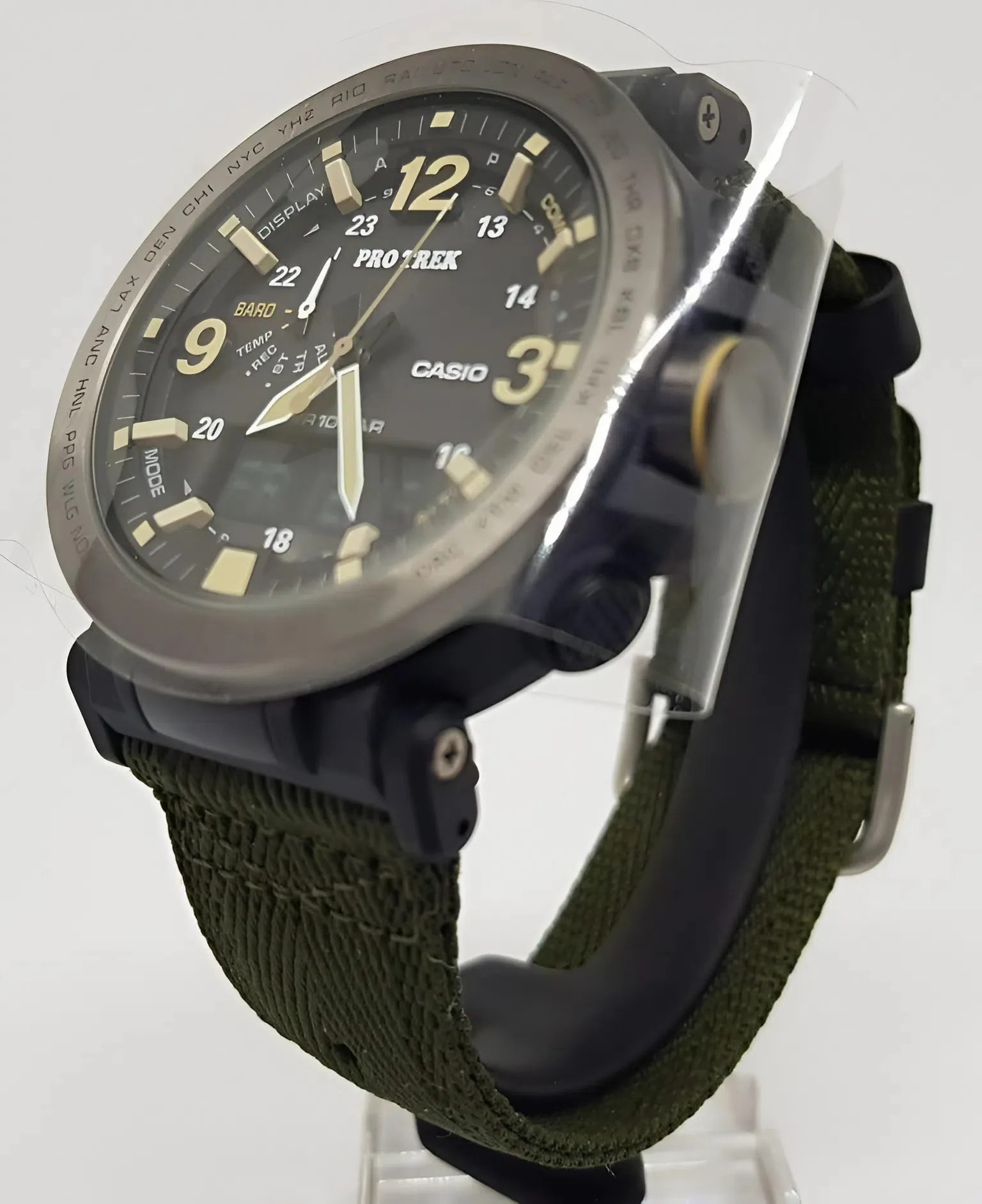 Khác với những phiên bản dây nhựa hay kim loại truyền thống, Đồng Hồ Casio Nam PRG-600YB-3DR gây ấn tượng mạnh mẽ nhờ bộ dây vải (Cloth Band) màu xanh olive đặc trưng. Chất liệu vải cao cấp không chỉ mang lại cảm giác nhẹ nhàng, thoáng khí khi vận động mạnh mà còn cực kỳ bền bỉ trong môi trường khắc nghiệt.