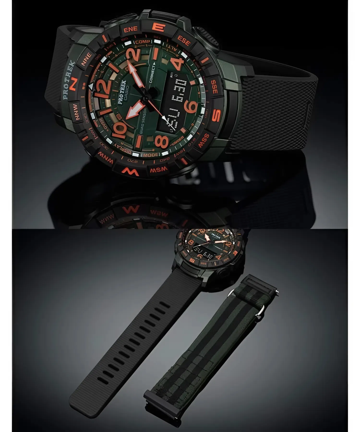 Về mặt thẩm mỹ, Đồng Hồ Casio Nam PRT-B50FE-3DR khoác lên mình phối màu xanh lục đậm (Army Green) kết hợp cùng sắc đen nhám, tạo nên vẻ ngoài mạnh mẽ và lỳ lợm. Điểm nhấn đắt giá nhất nằm ở các kim chỉ giờ và cọc số màu cam rực rỡ, giúp tăng tối đa khả năng quan sát trong điều kiện ánh sáng yếu hoặc khi đang di chuyển nhanh.