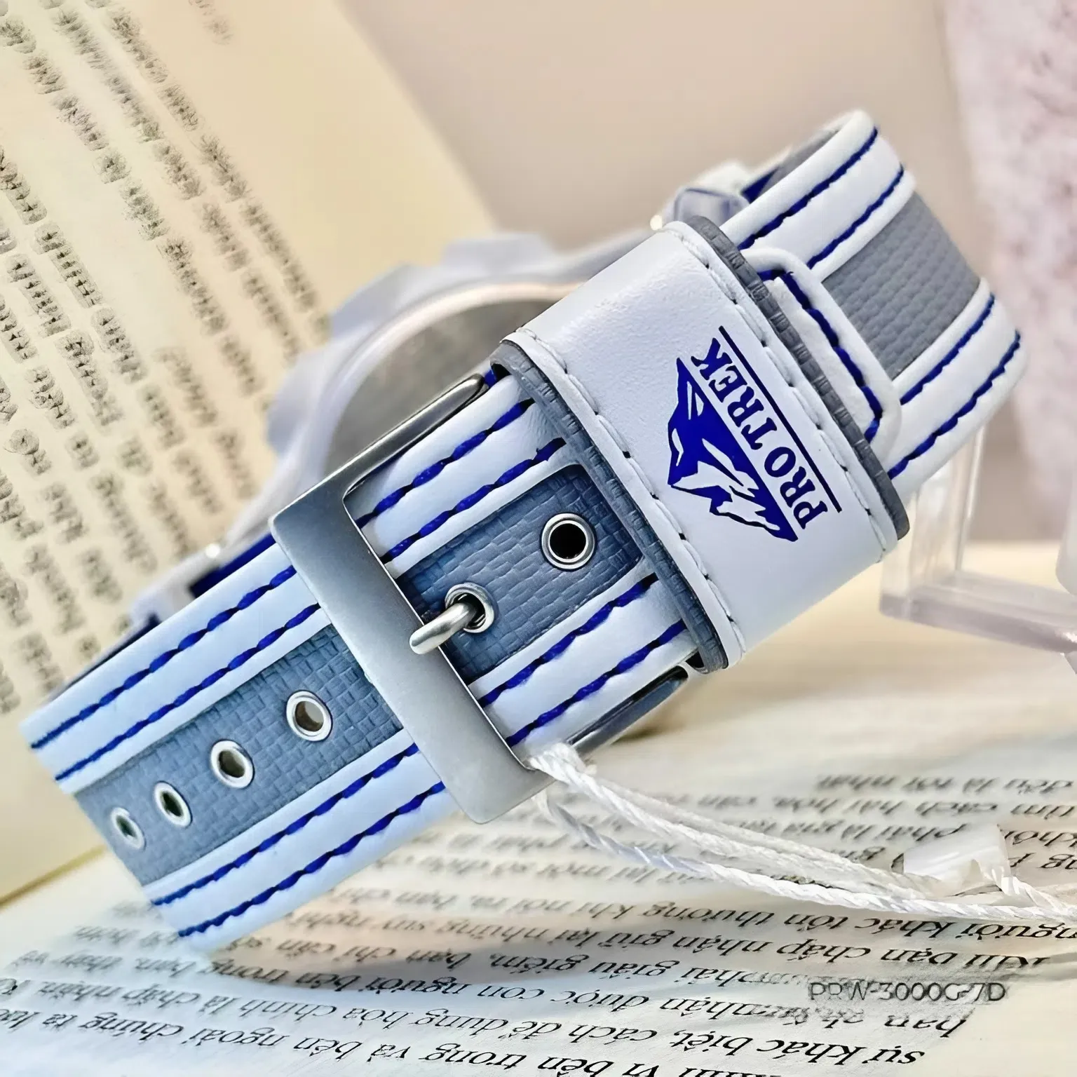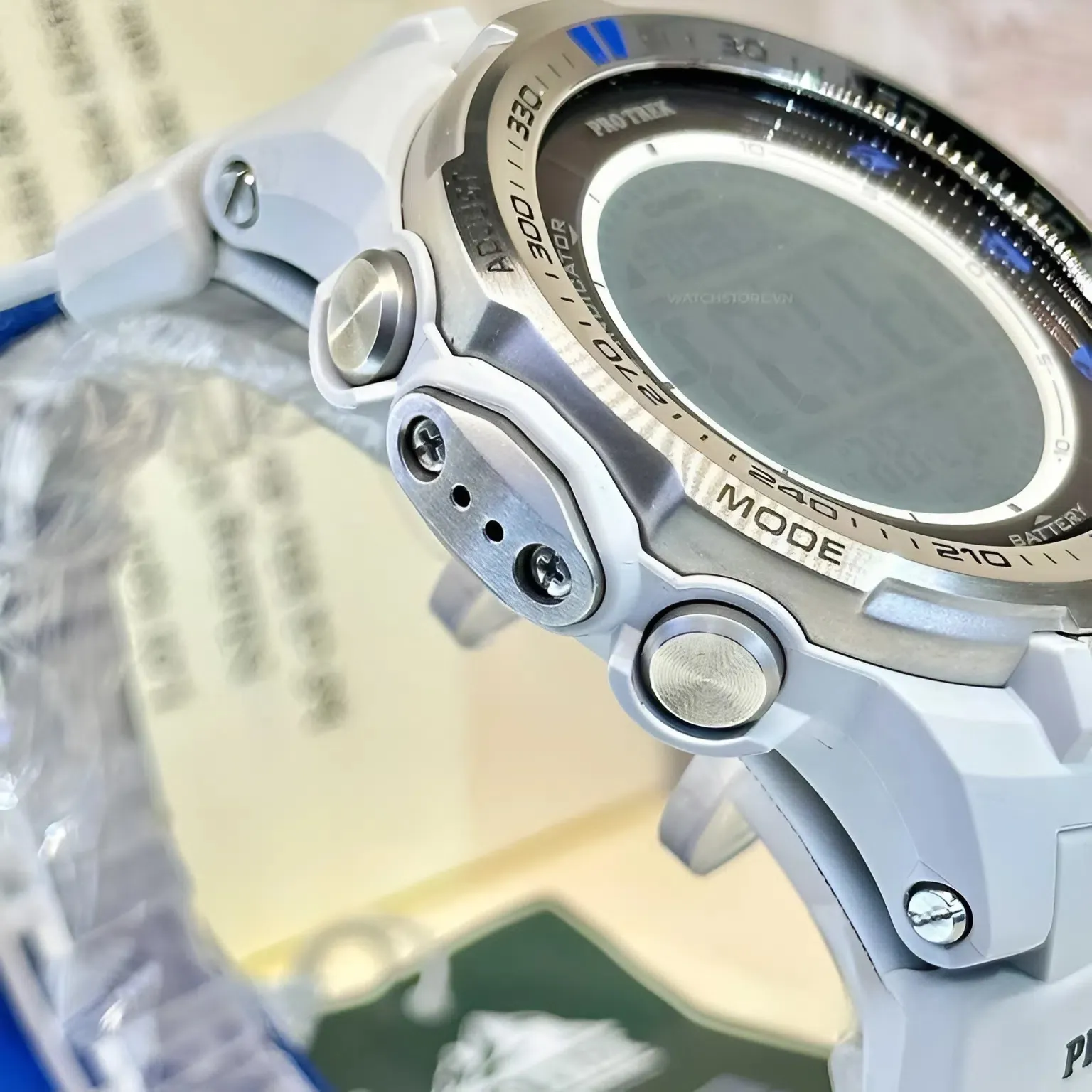 Thông thường, các dòng đồng hồ chuyên dụng như Pro Trek hay G-Shock thường mang tone màu tối như đen, rêu hoặc xanh quân đội. Thế nhưng, Đồng Hồ Casio Nam PRW-3000G-7DR lại gây ấn tượng mạnh với sự kết hợp giữa vỏ màu bạc tinh tế, vành bezel xanh dương sâu thẳm và dây vải màu trắng tinh khôi.