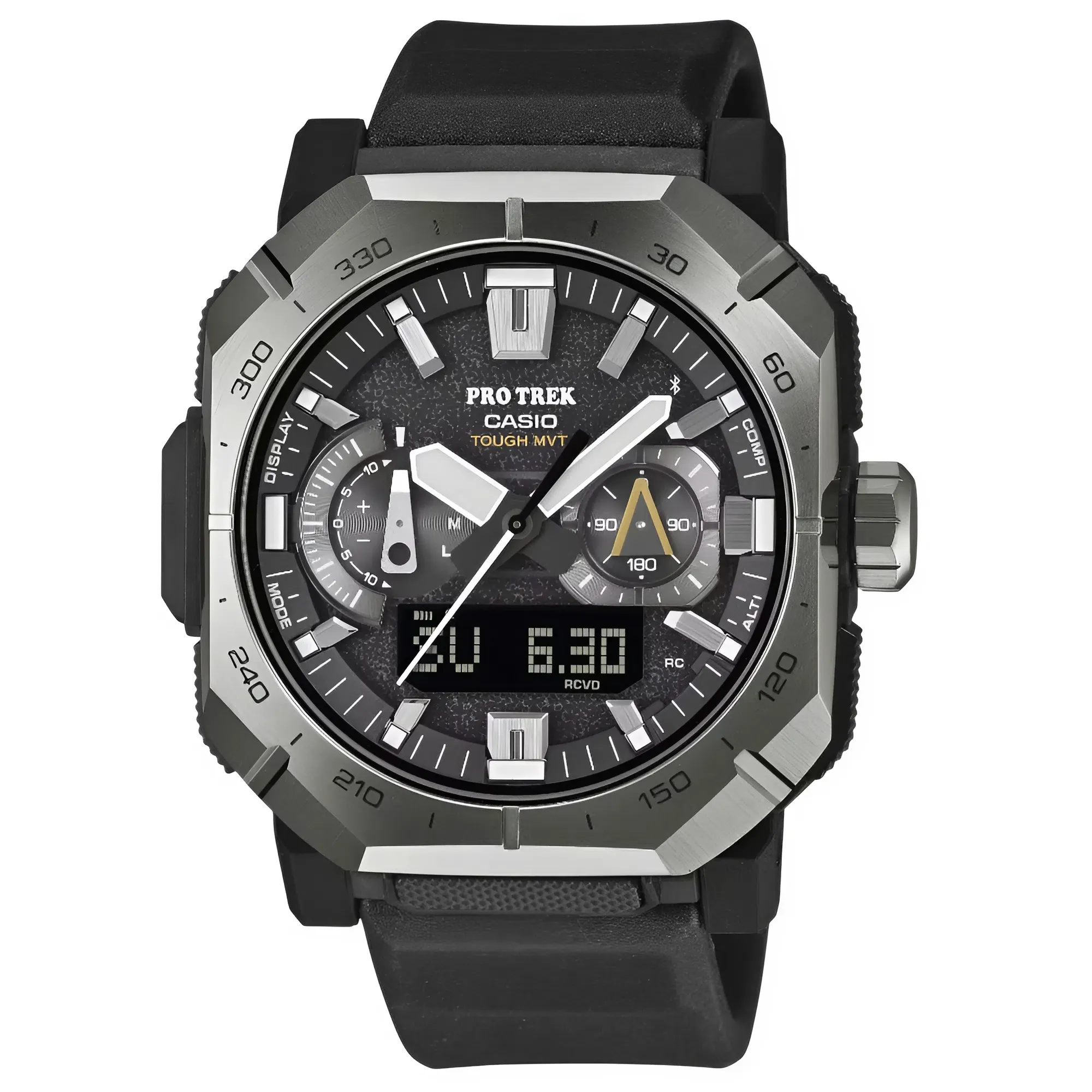 Điểm khác biệt lớn nhất của Đồng Hồ Casio Nam PRW-B1000-1DR so với các thế hệ trước chính là phần Bezel (vành băm) được làm từ thép không gỉ với các cạnh cắt vát sắc sảo. Thiết kế này không chỉ bảo vệ mặt kính tốt hơn mà còn tạo ra hiệu ứng thị giác vô cùng hiện đại.