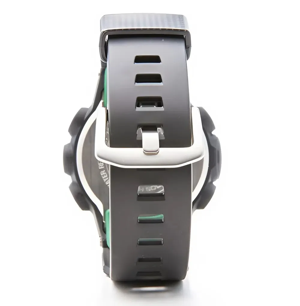 Sự bổ sung này giúp dây đeo gần như không thể bị đứt gãy hay biến dạng trước những tác động khắc nghiệt của môi trường như nhiệt độ cao, độ ẩm hay sự mài mòn. Điểm xuyết trên nền dây đen là những chi tiết màu xanh lá nổi bật, tạo nên một phong cách thể thao đầy năng động và cá tính.