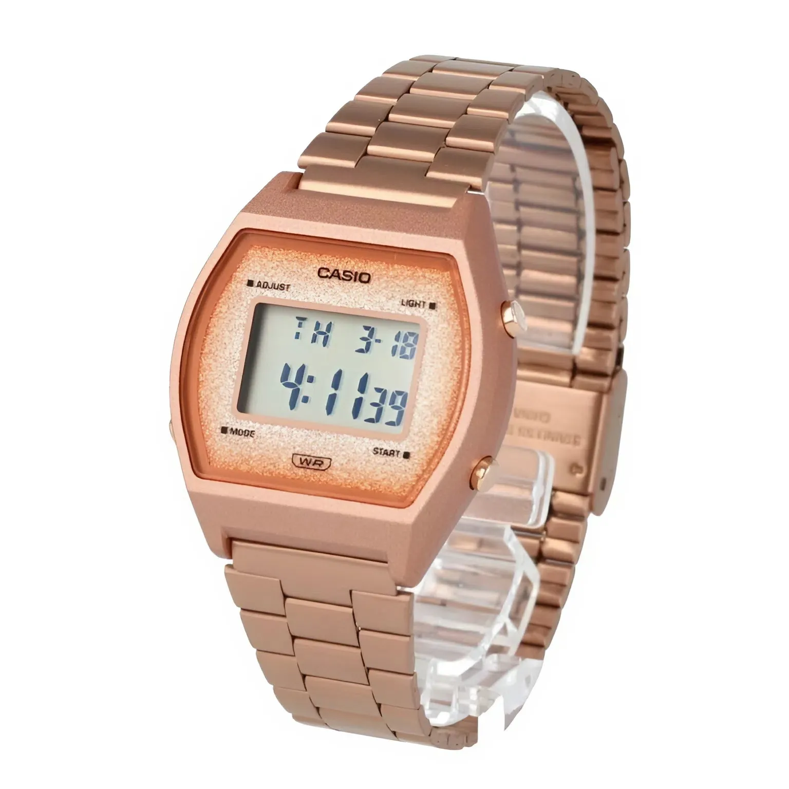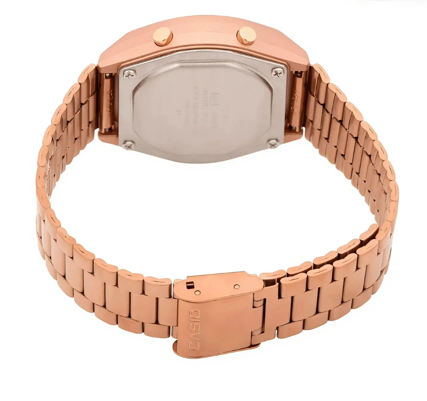 Điểm đầu tiên khiến bất kỳ quý cô nào cũng phải xiêu lòng trước Đồng Hồ Casio Nữ B640WCG-5DF chính là lớp mạ ion màu hồng vàng (Rose Gold) bao phủ toàn bộ thân máy. Không quá rực rỡ như vàng nguyên bản, cũng không lạnh lùng như sắc bạc, Rose Gold mang đến sự ấm áp, nhã nhặn và đặc biệt là khả năng "nịnh" da tuyệt vời.
