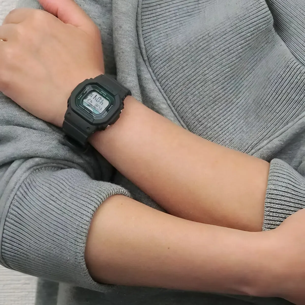 Style Vintage 90s: Phối cùng quần Jeans cạp cao, áo thun Oversize đóng thùng và một chiếc băng đô màu sắc. Sắc xám xanh của đồng hồ sẽ là mảnh ghép hoàn hảo cho vẻ ngoài hoài cổ này.