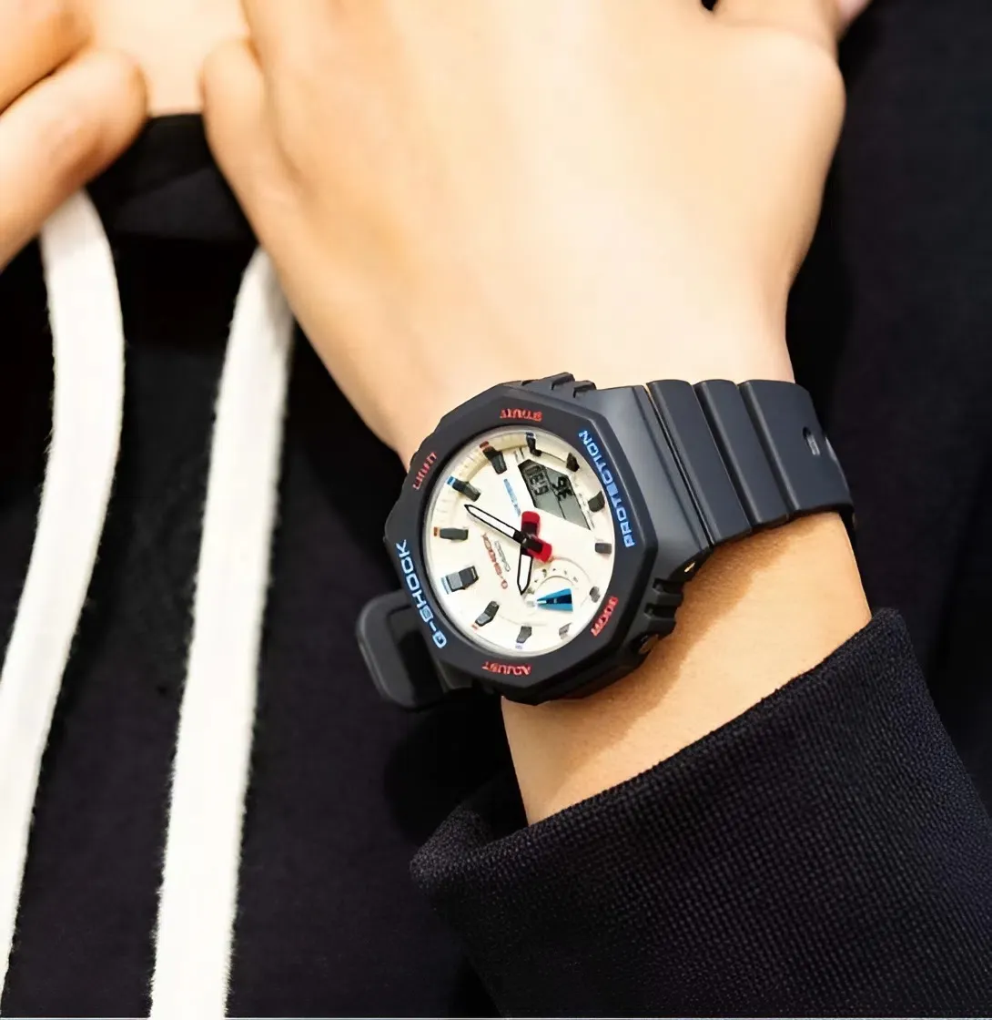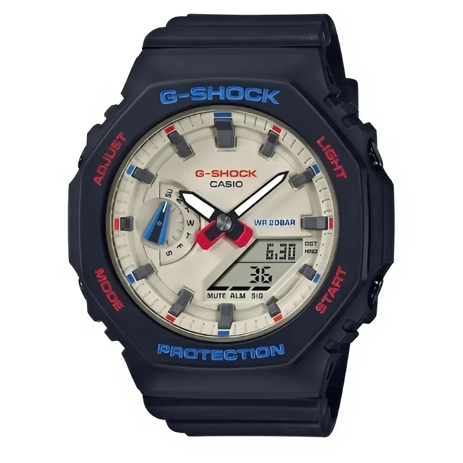 Khác với những người anh em cùng dòng, Đồng Hồ Casio Nữ GMA-S2100WT-1ADR gây ấn tượng mạnh nhờ sự kết hợp giữa 4 tông màu: Đen, Trắng, Đỏ và Xanh dương.