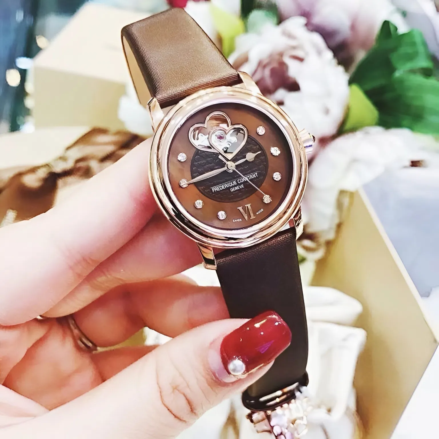 Khác với những tông màu đồng hồ nữ thường thấy, Frederique Constant chọn sắc nâu đỏ độc đáo – màu của sự trưởng thành, quyến rũ và quyền lực mềm. Dưới ánh sáng, mặt số ánh lên lớp vân sóng tinh tế, phản chiếu ánh vàng hồng từ bộ vỏ thép mạ PVD cao cấp, tạo nên hiệu ứng thị giác lôi cuốn, thanh tao và đậm chất quý phái.