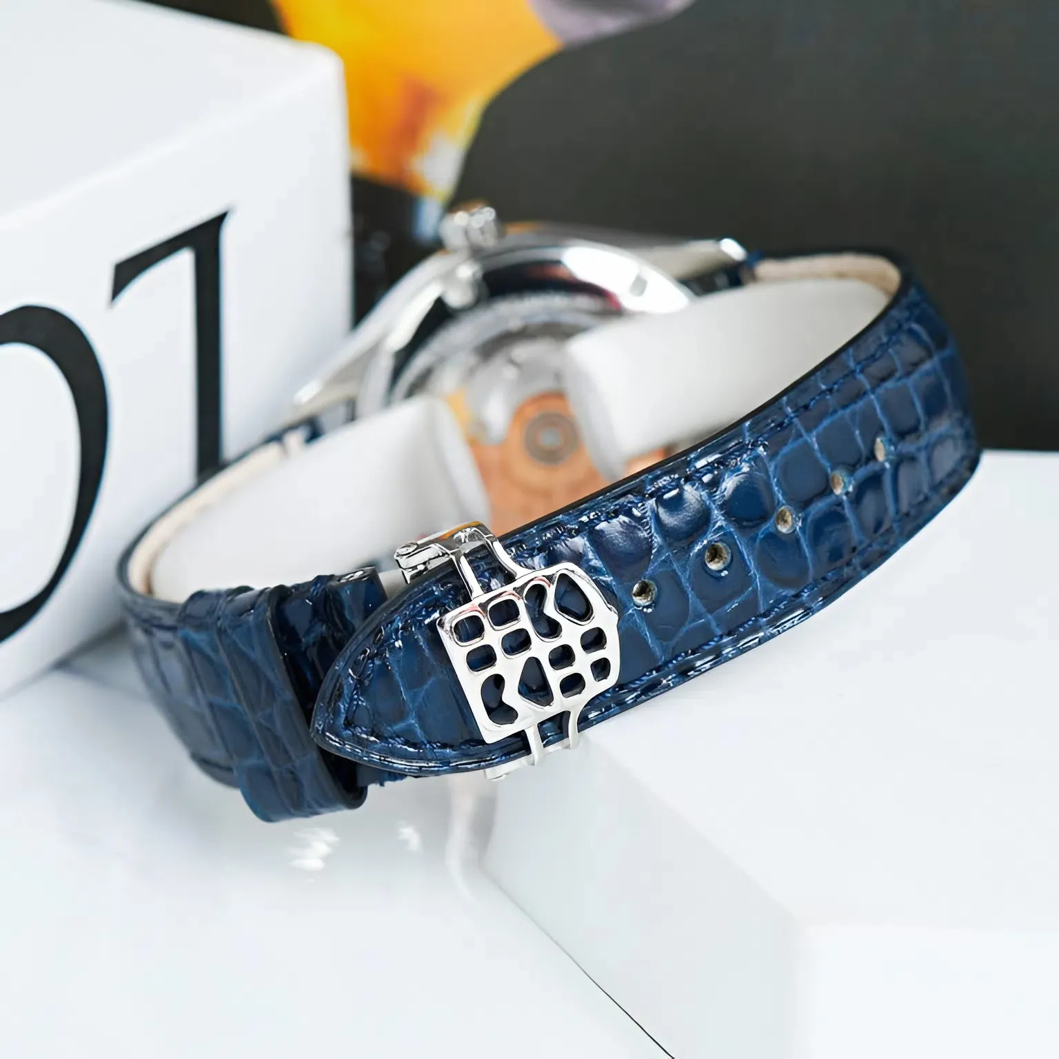 Sắc Xanh Navy Quý Phái: Mặt số màu xanh navy sâu thẳm mang đến sự bí ẩn và thanh lịch. Họa tiết trang trí tinh xảo trên mặt số đóng vai trò như một phông nền hoàn hảo để tôn lên độ sáng của vỏ thép và các chi tiết đính kim cương.
